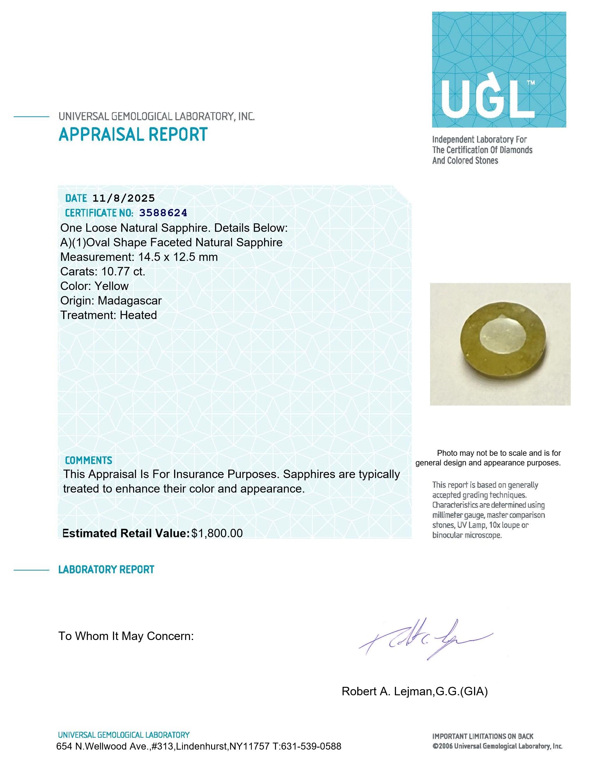 10.77 Carats Natural Yellow Sapphire Loose | Estimated Retail Value $1,800 (UGL)
