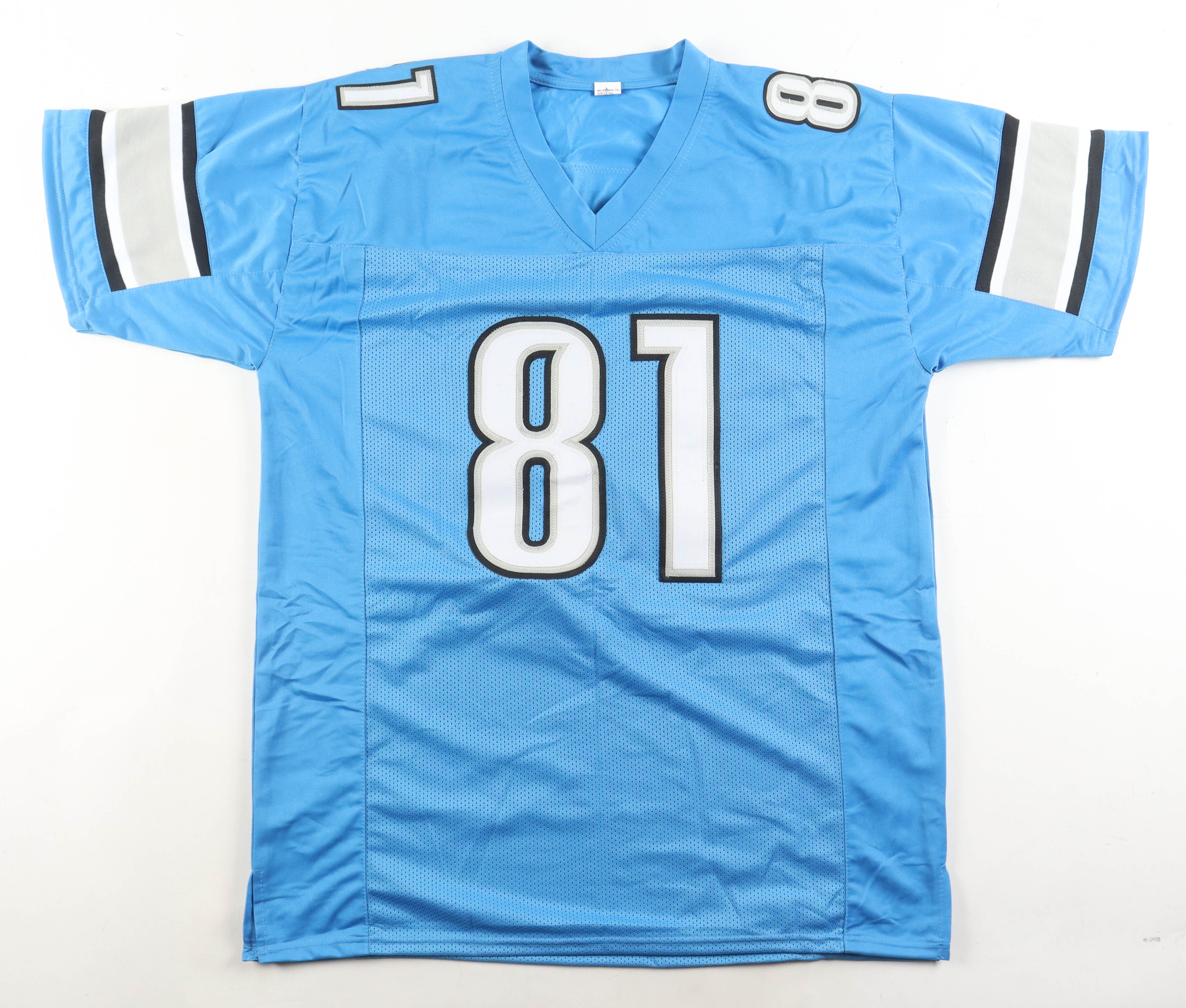 Custom jersey with everything sewn on, size XL. Has been hand-signed by Calvin Johnson.