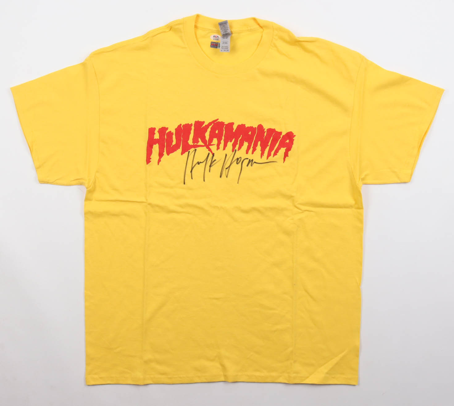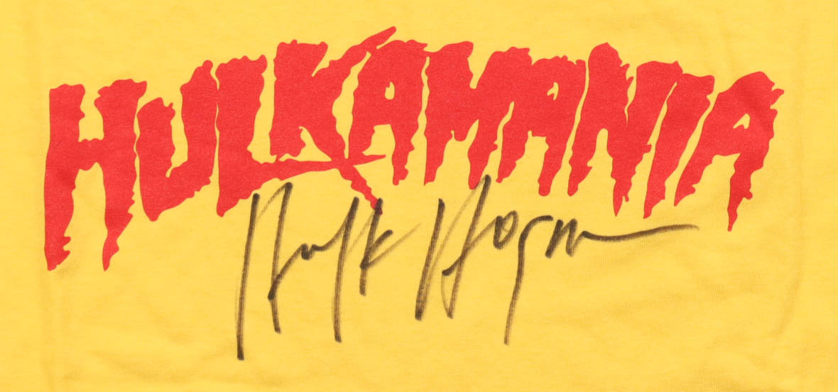 Gildan t-shirt with everything printed on, size XL. Hand-signed by Hulk Hogan (HOF).