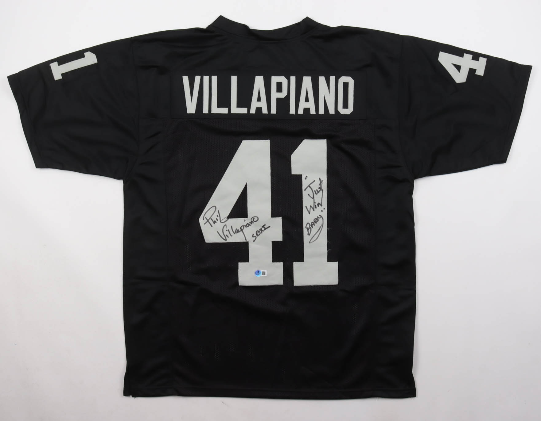 Custom jersey with everything sewn on, size XL. Hand-signed and inscribed by Phil Villapiano.