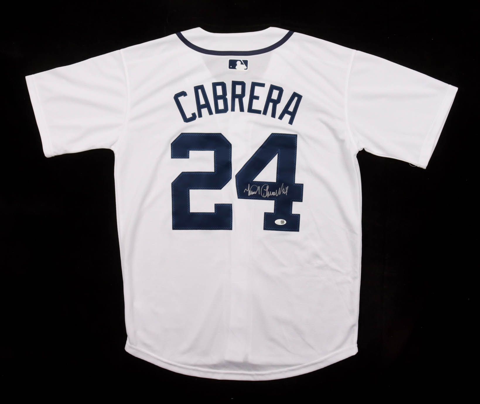 Nike jersey with everything sewn on, size L. Hand-signed by Miguel Cabrera (Detroit Tigers).
