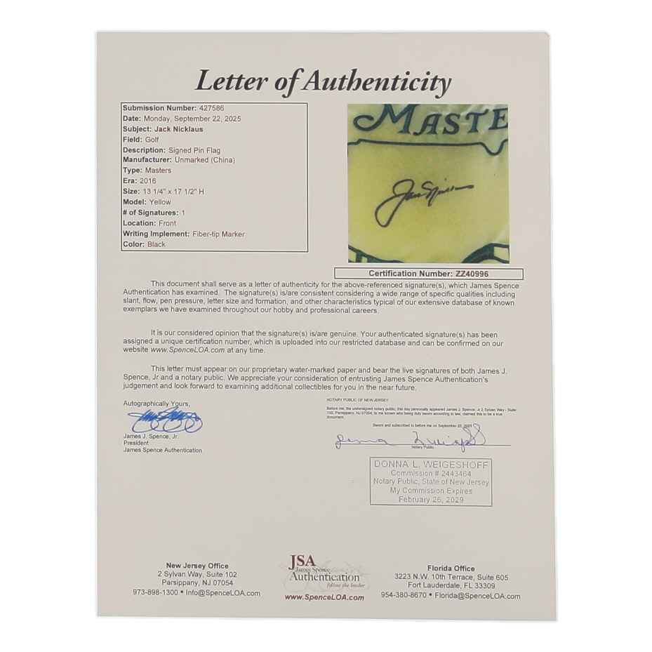 Pin flag measures approximately 13" x 17" in size and has been hand-signed by Jack Nicklaus (HOF).