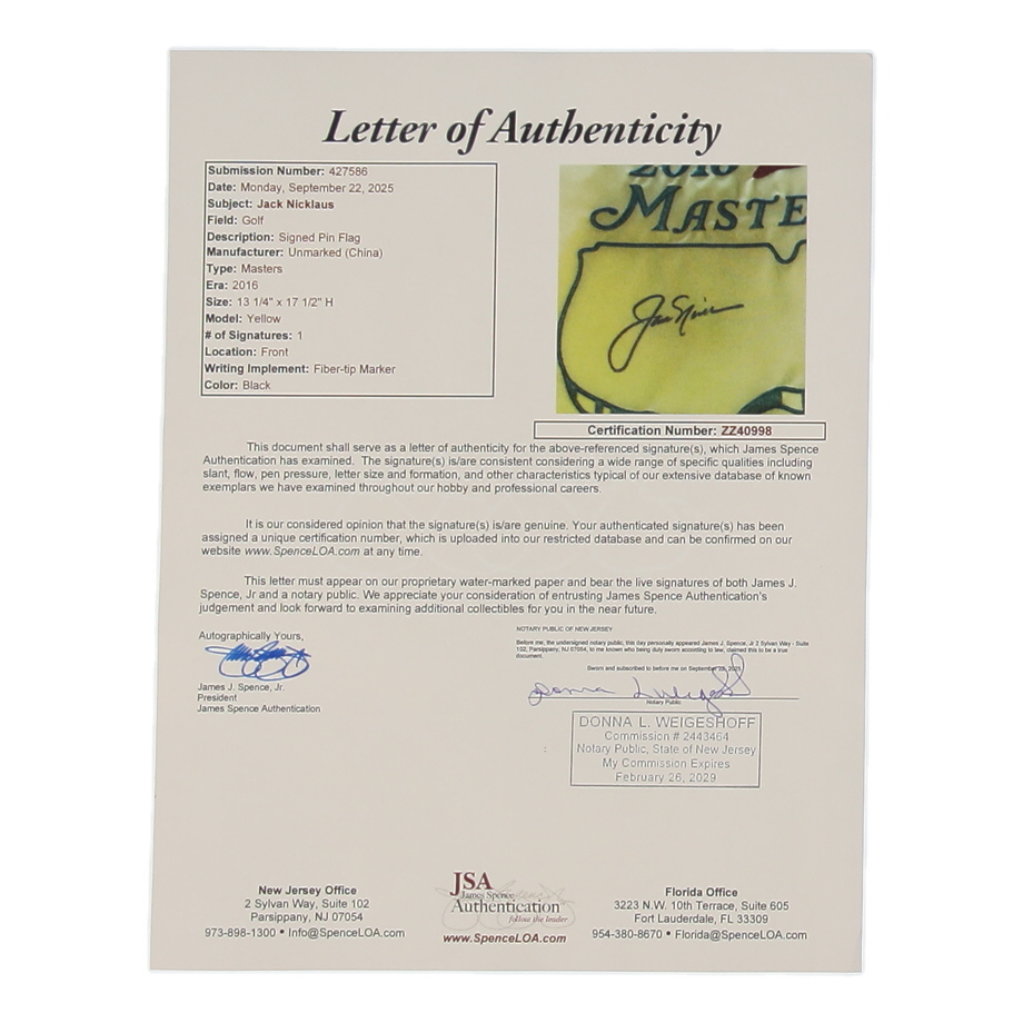 Jack Nicklaus Signed 2016 Masters Tournament Pin Flag (JSA)