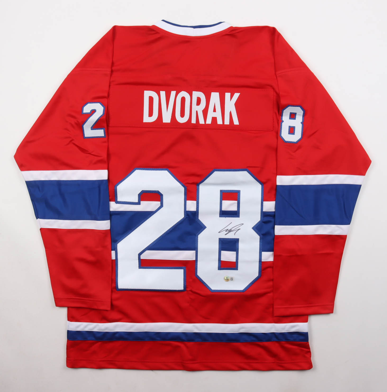 Custom jersey with everything sewn on, size XL. Hand-signed by Christian Dvorak