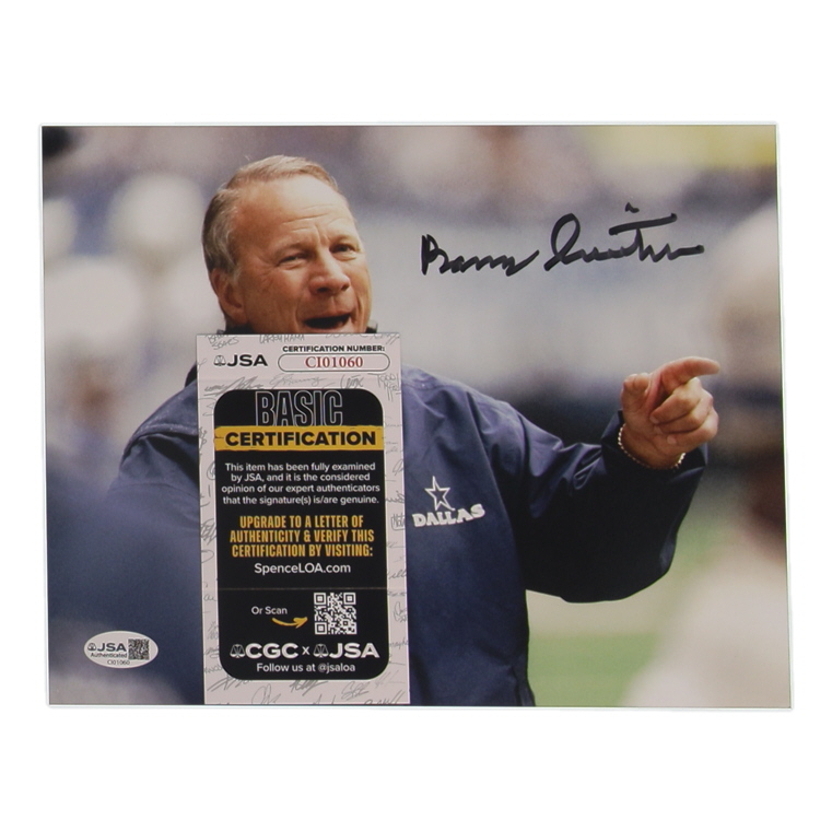 Photo measures 8" x 10" in size and has been hand-signed by Barry Switzer (Dallas Cowboys).