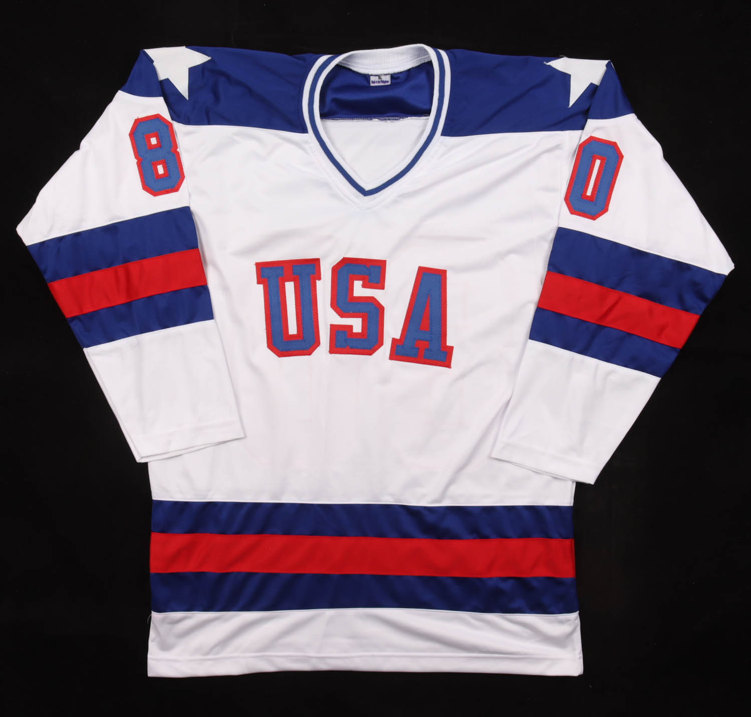 Custom style jersey with everything sewn on, size XL. Hand-signed by (18) with Mike Eruzione, Steve Janaszak, Bill Baker, Dave Christian, Ken Morrow, Mike Ramsey, Neal Broten, Rob McClanahan, Steve Christoff, Mark Johnson, William Schneider, Eric Strobel, Phil Verchota, Jim Craig, Coach Craig Patrick and John Harrington.