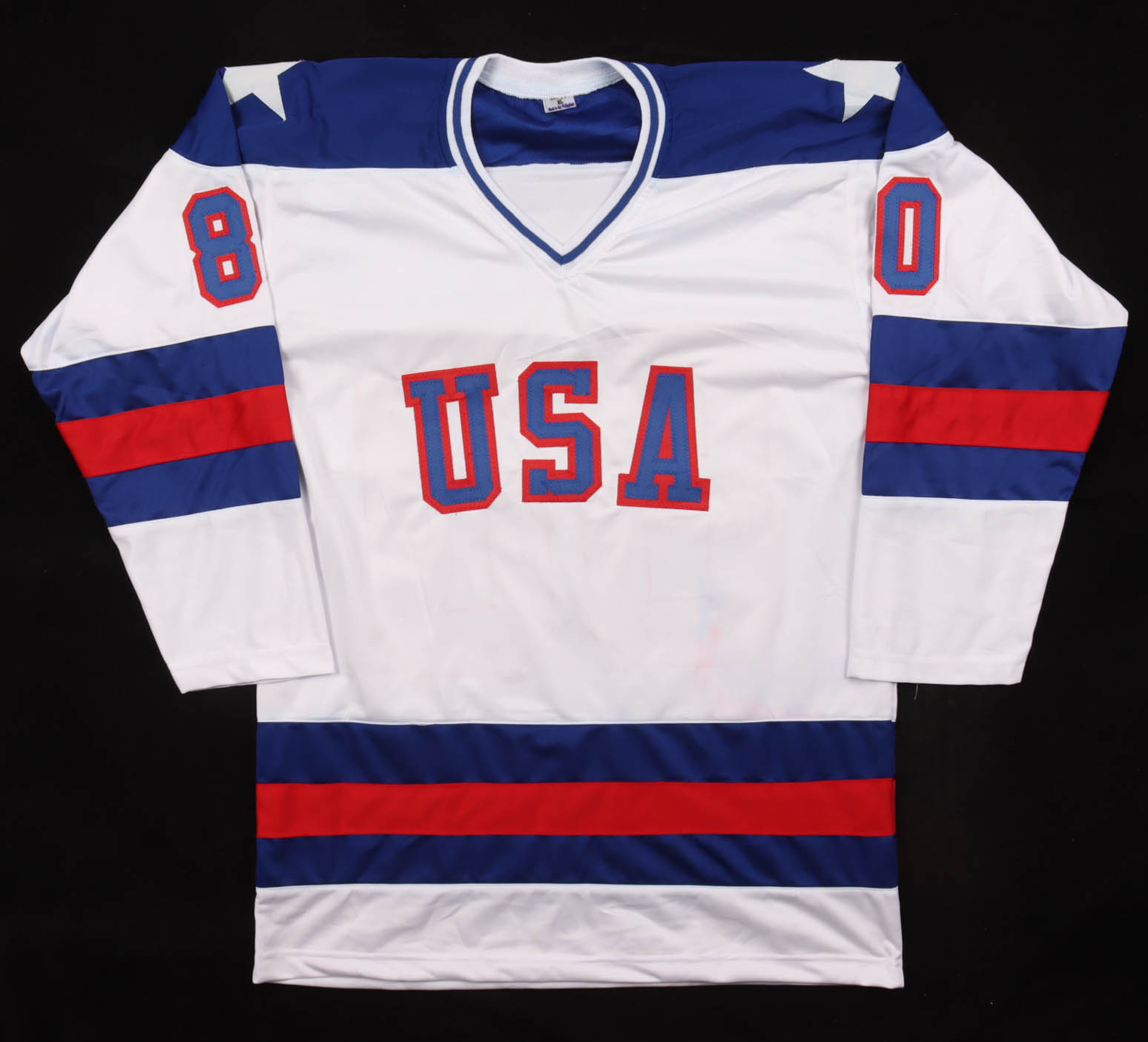 Custom style jersey with everything sewn on, size XL. Hand-signed by (18) with Mike Eruzione, Steve Janaszak, Bill Baker, Dave Christian, Ken Morrow, Mike Ramsey, Neal Broten, Rob McClanahan, Steve Christoff, Mark Johnson, William Schneider, Eric Strobel, Phil Verchota, Jim Craig, Coach Craig Patrick and John Harrington.