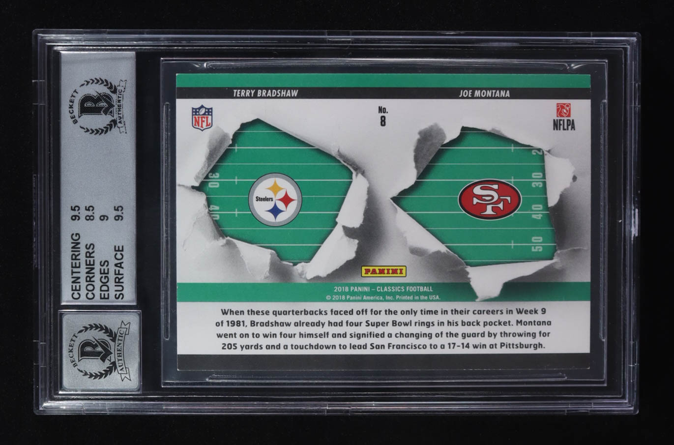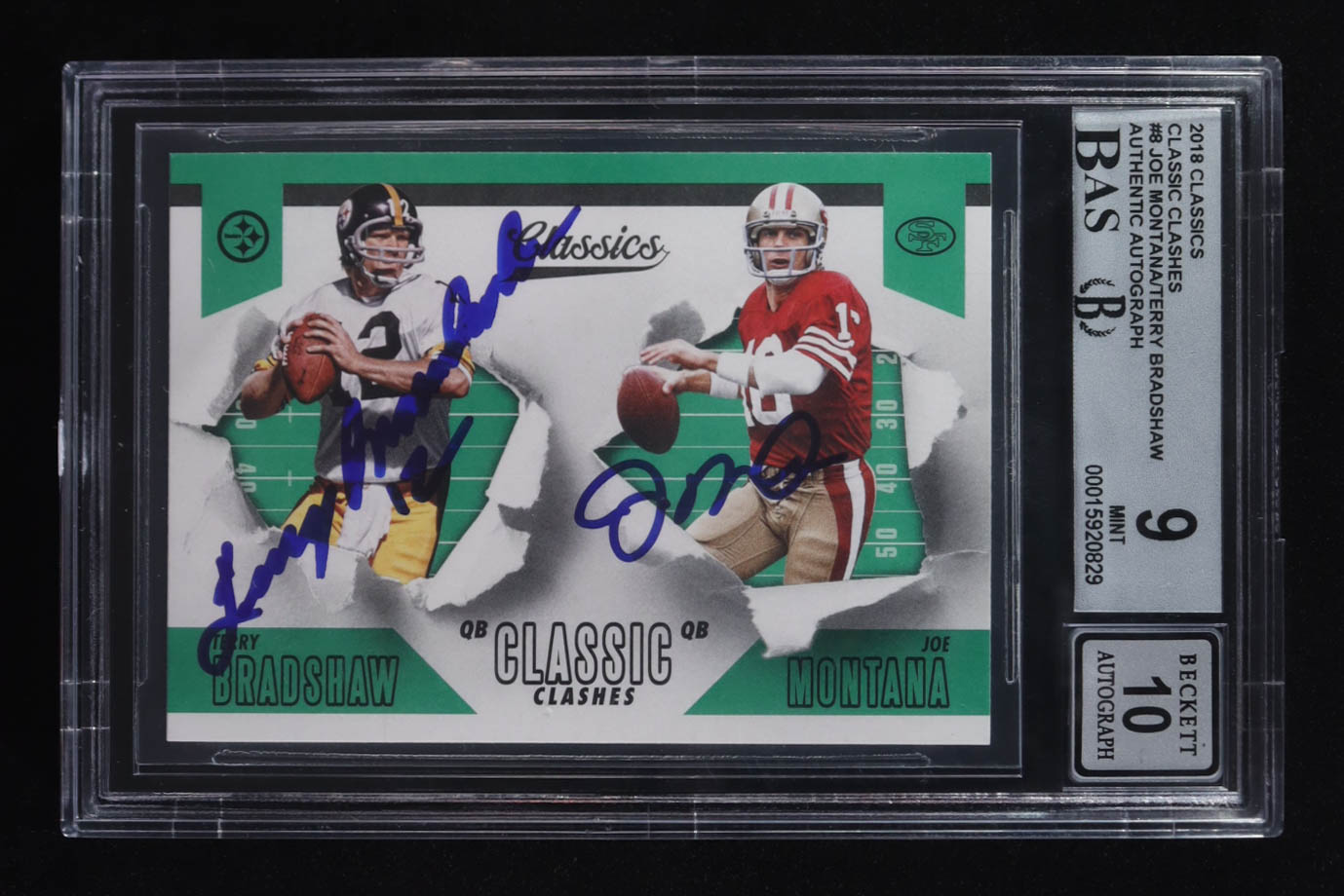 Terry Bradshaw / Joe Montana Signed 2018 Panini QB Classic Clashes #8 (BAS 9 | Autograph Graded BAS 10)