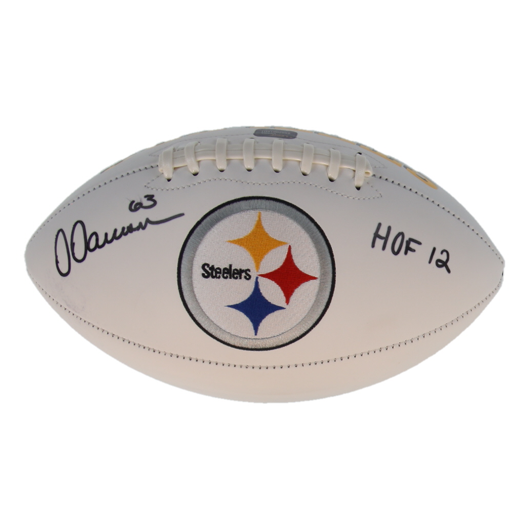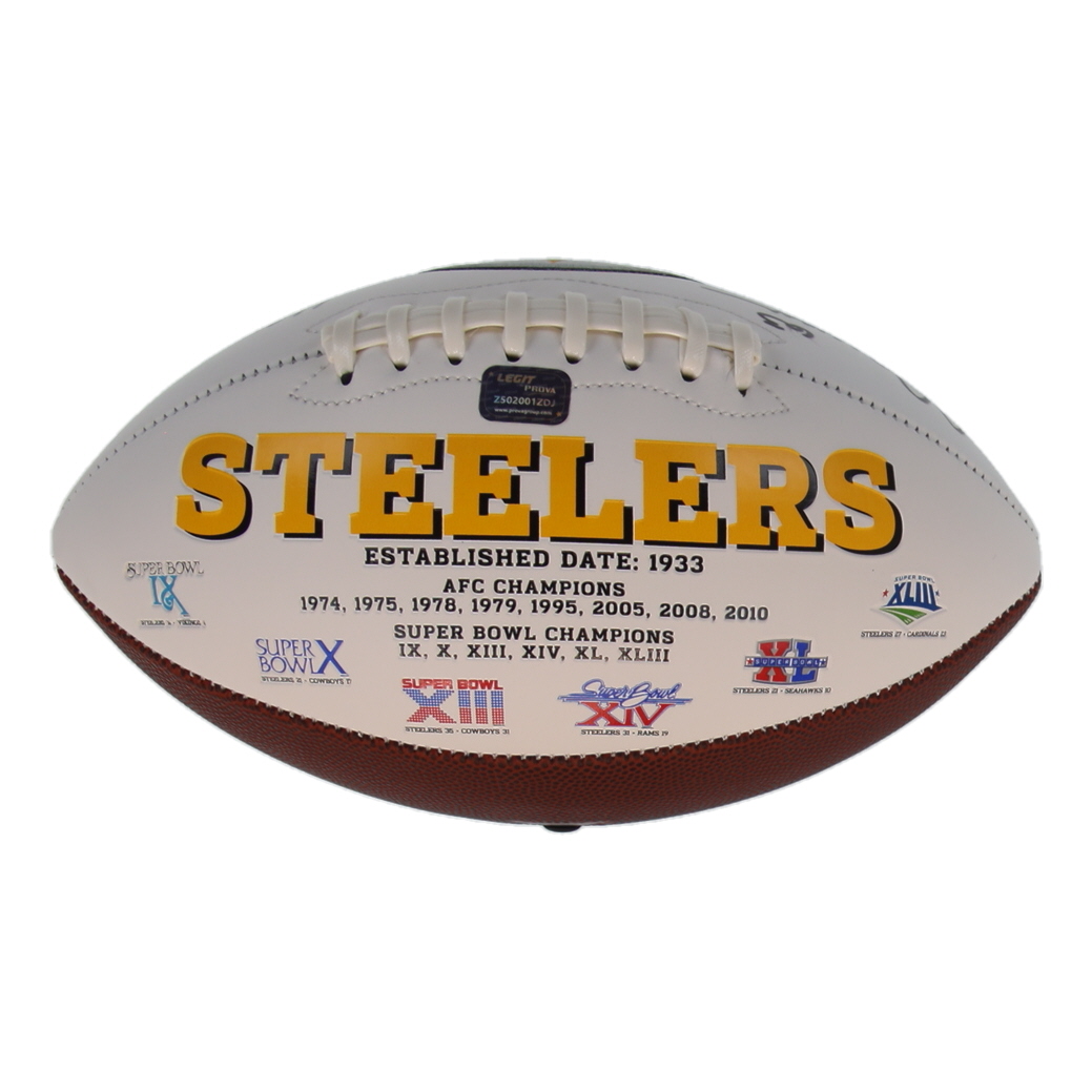 Pittsburgh Steelers Logo Football. Hand-signed and inscribed by Dermontti Dawson (HOF). Please note, the signature has been smudged and there are stains throughout the football.