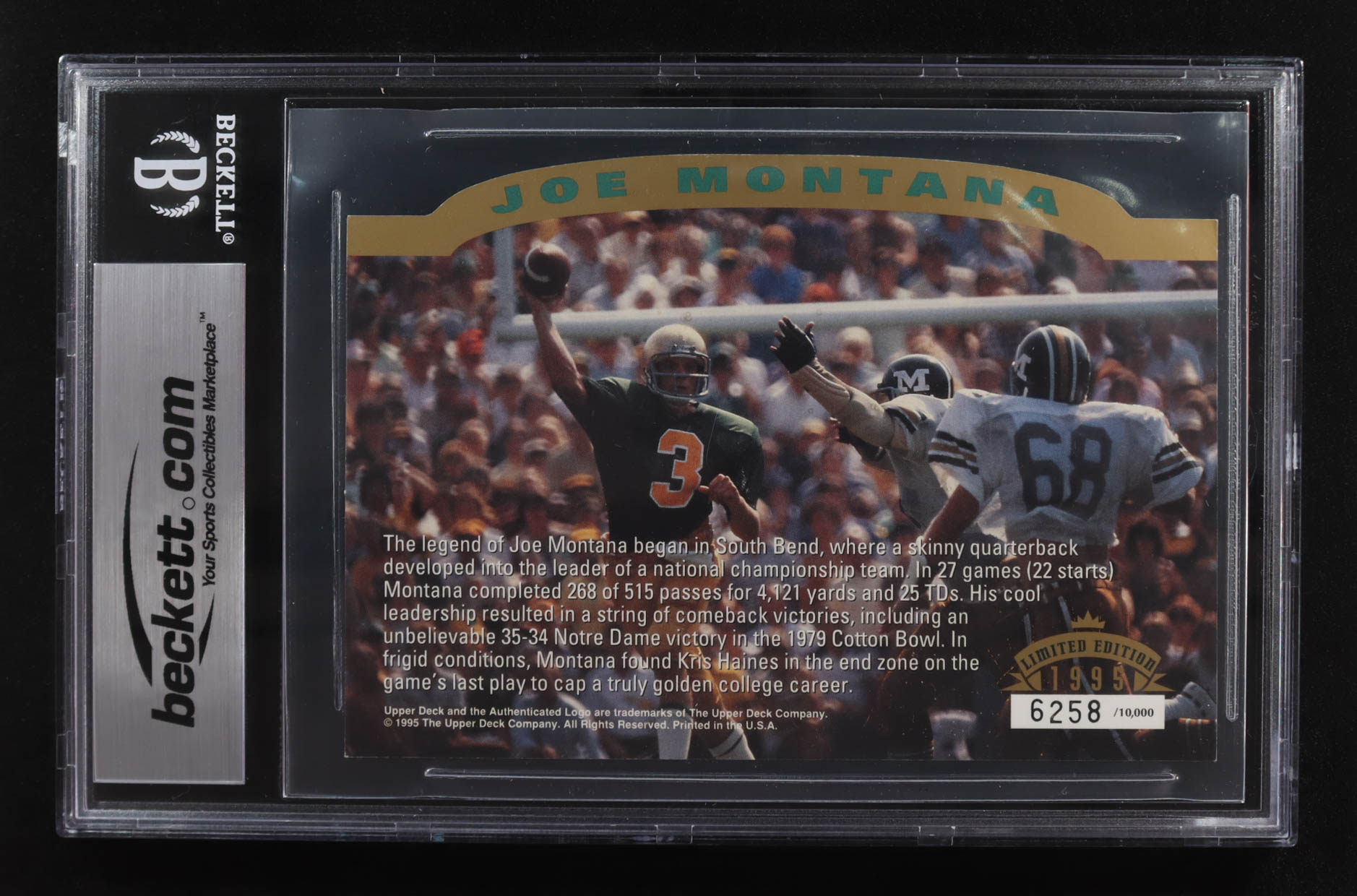 Joe Montana Signed 1993-97 Upper Deck Commemorative Cards A Golden Tradition Authenticated Memorabilia Oversized #5 #6258/10,000 (BGS | Autograph Graded BGS 10)