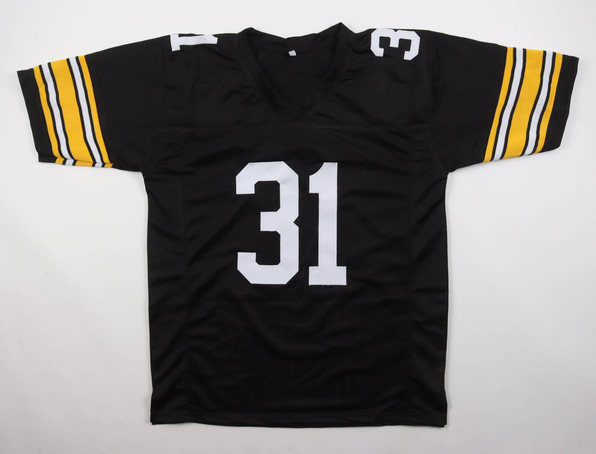 Custom jersey with everything sewn on, size XL. Hand-signed and inscribed by Donnie Shell (Pittsburgh Steelers, HOF).