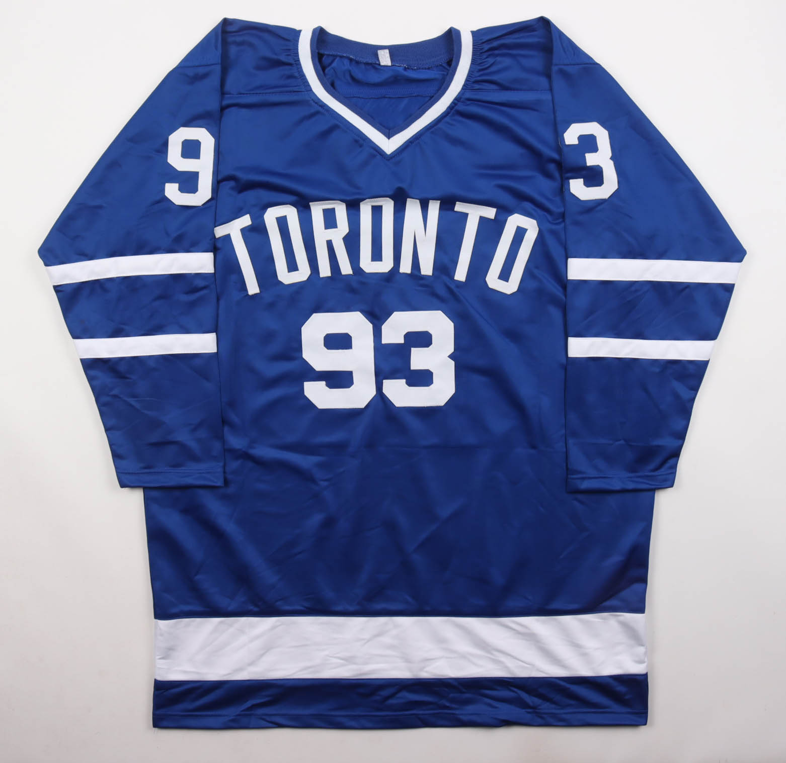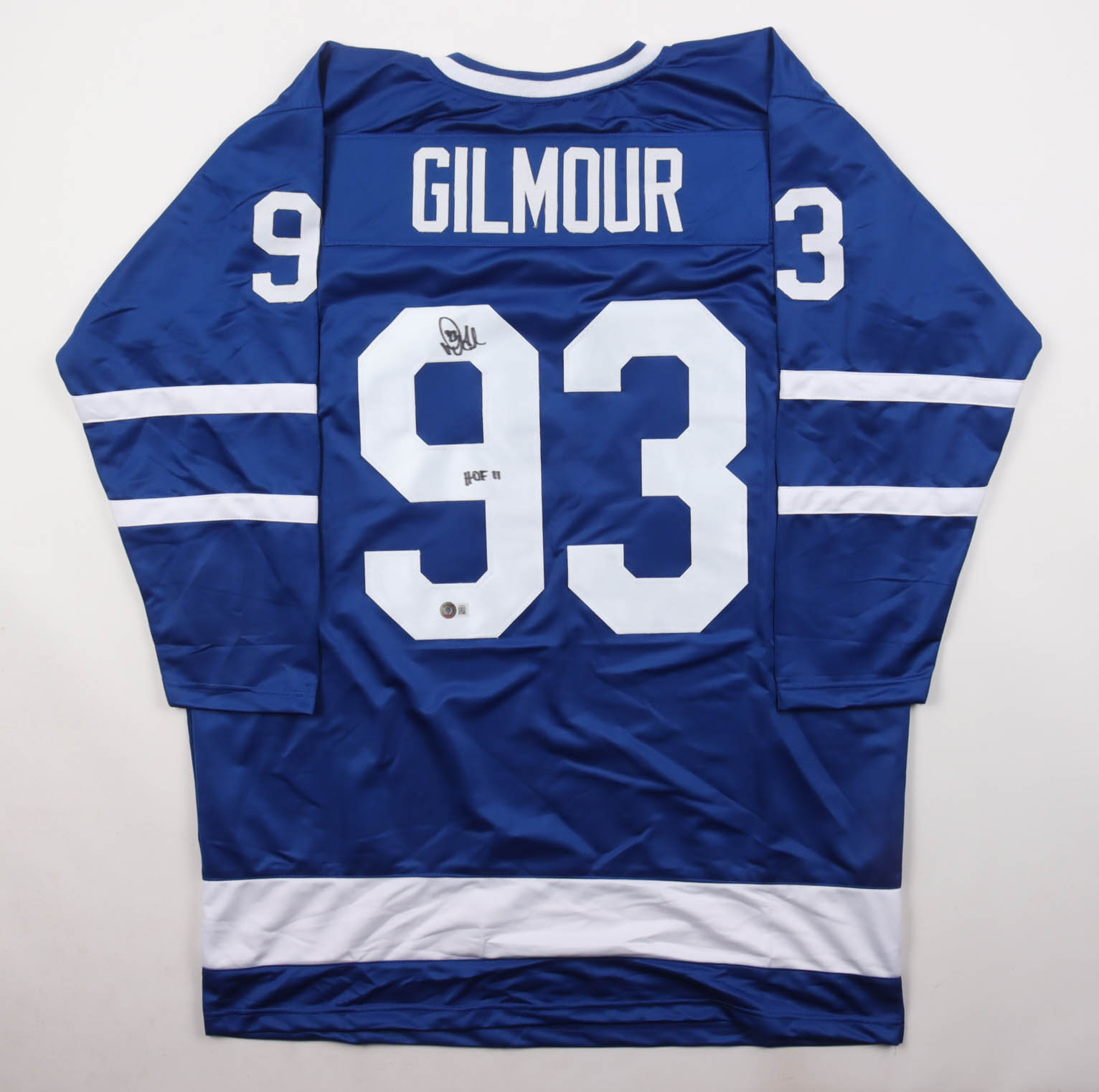 Custom jersey with everything sewn on, size XL. Hand-signed and inscribed by Doug Gilmour (Toronto Maple Leafs, HOF).