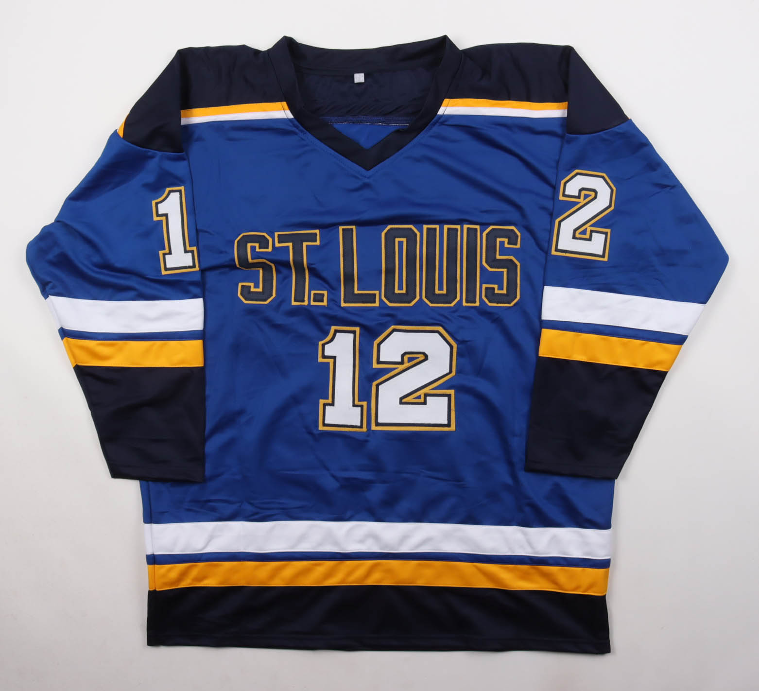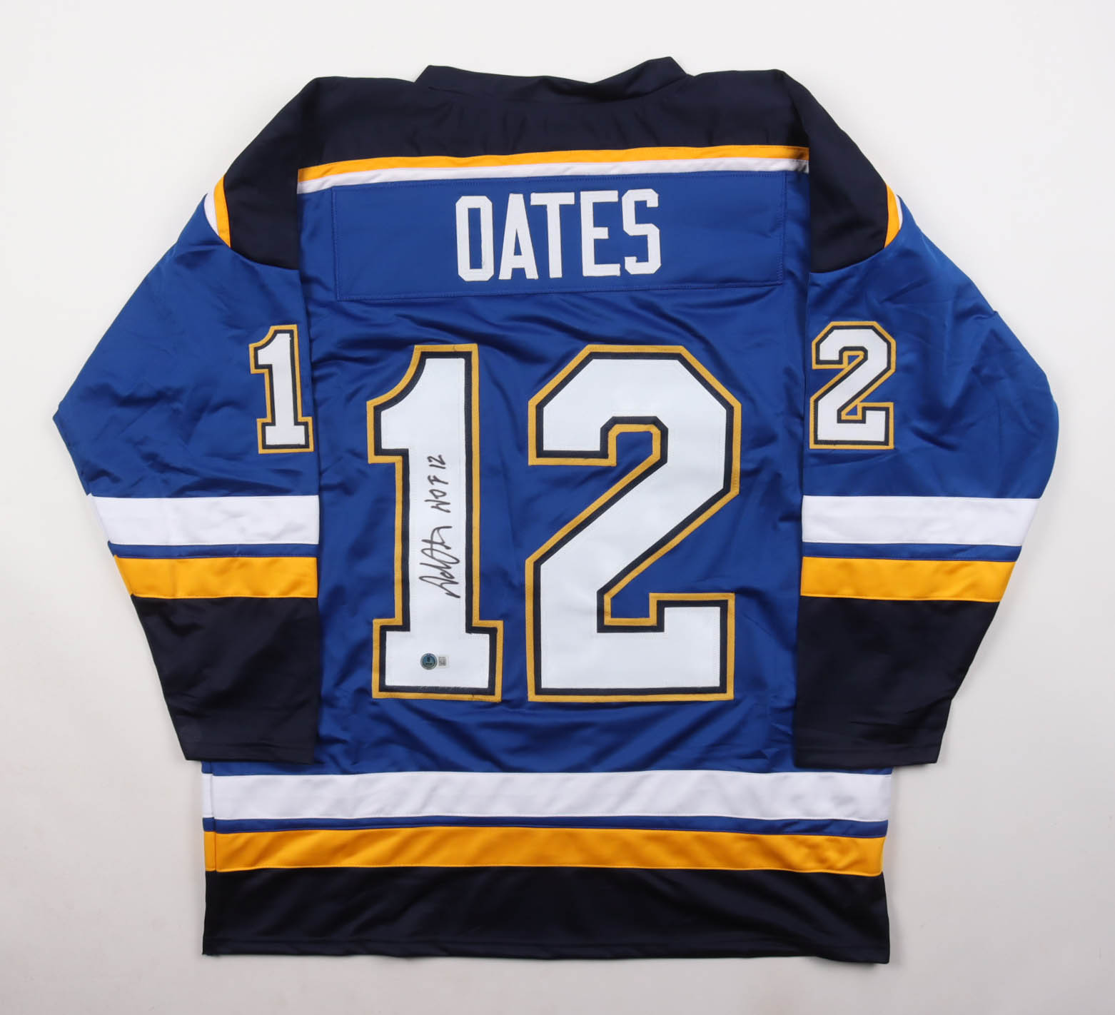 Custom jersey with everything sewn on, size XL. Hand-signed and inscribed by Adam Oates (St. Louis Blues, HOF).