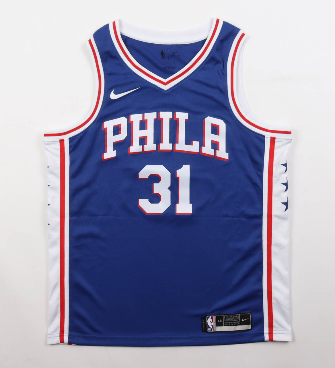 Nike authentic jersey with everything pressed on, size 48. Hand-signed and inscribed by Seth Curry (Philadelphia 76ers).