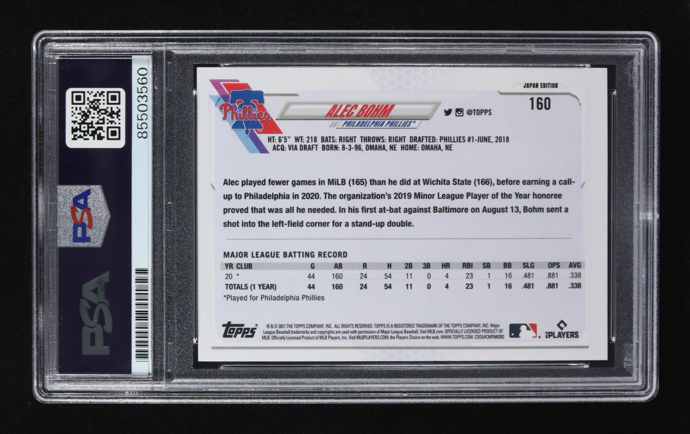 Alec Bohm Signed 2021 Topps Japan Edition #160 RC (PSA)