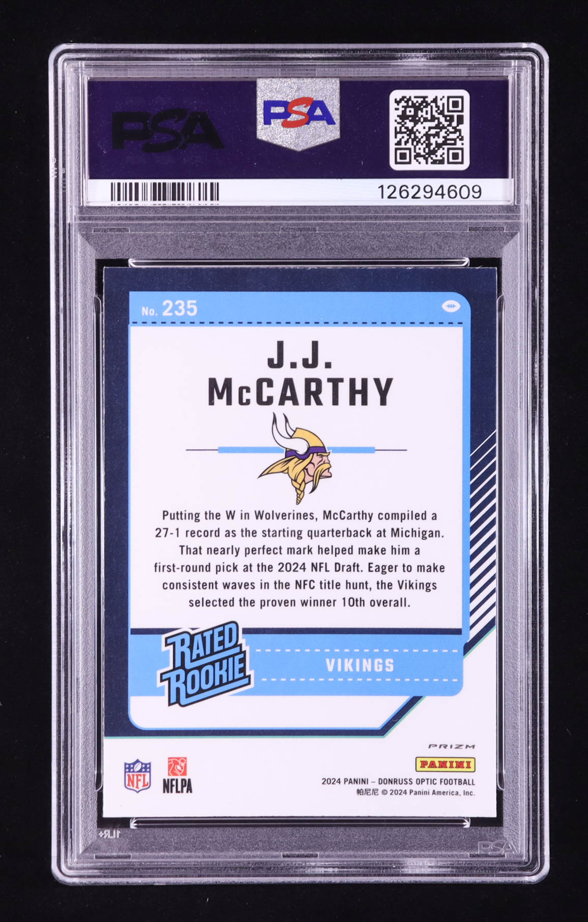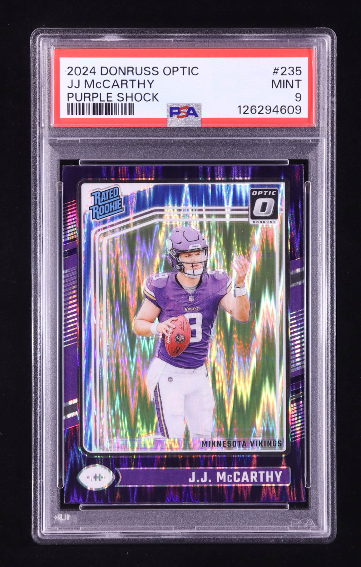 JJ McCarthy 2024 Donruss Optic Purple Shock #235 RR RC (PSA 9)