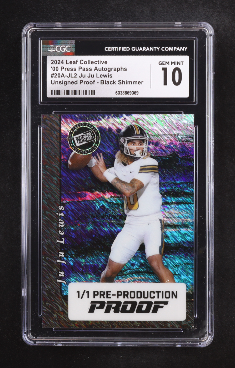 Juju Lewis 2024 Leaf Collective Press Pass '00 Autographs Pre-Production Proof Black Shimmer #20AJL2 #1/1 RC (CGC 10)