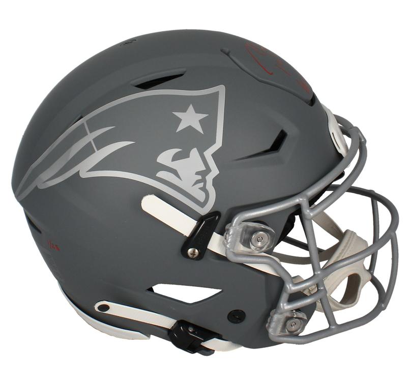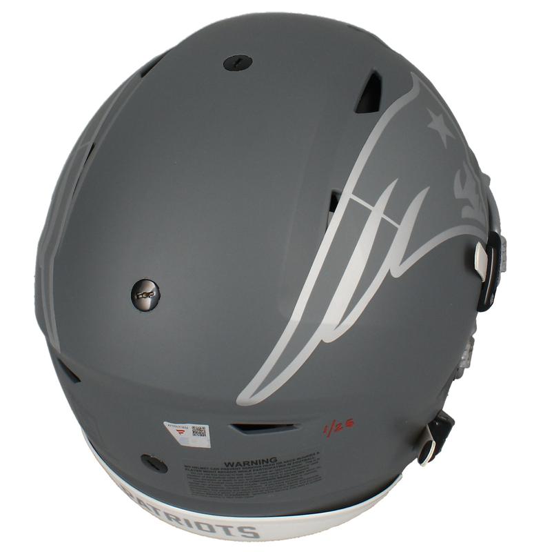 Riddell New England Patriots full-size authentic on-field slate alternate speedflex helmet. Hand-signed and inscribed by Tom Brady. This item is limited edition and has been numbered #1/25.
