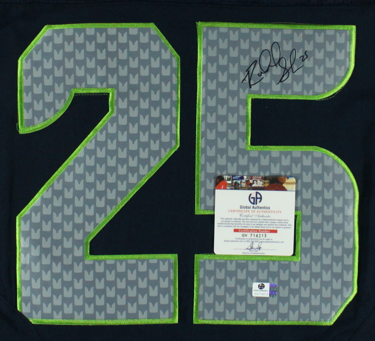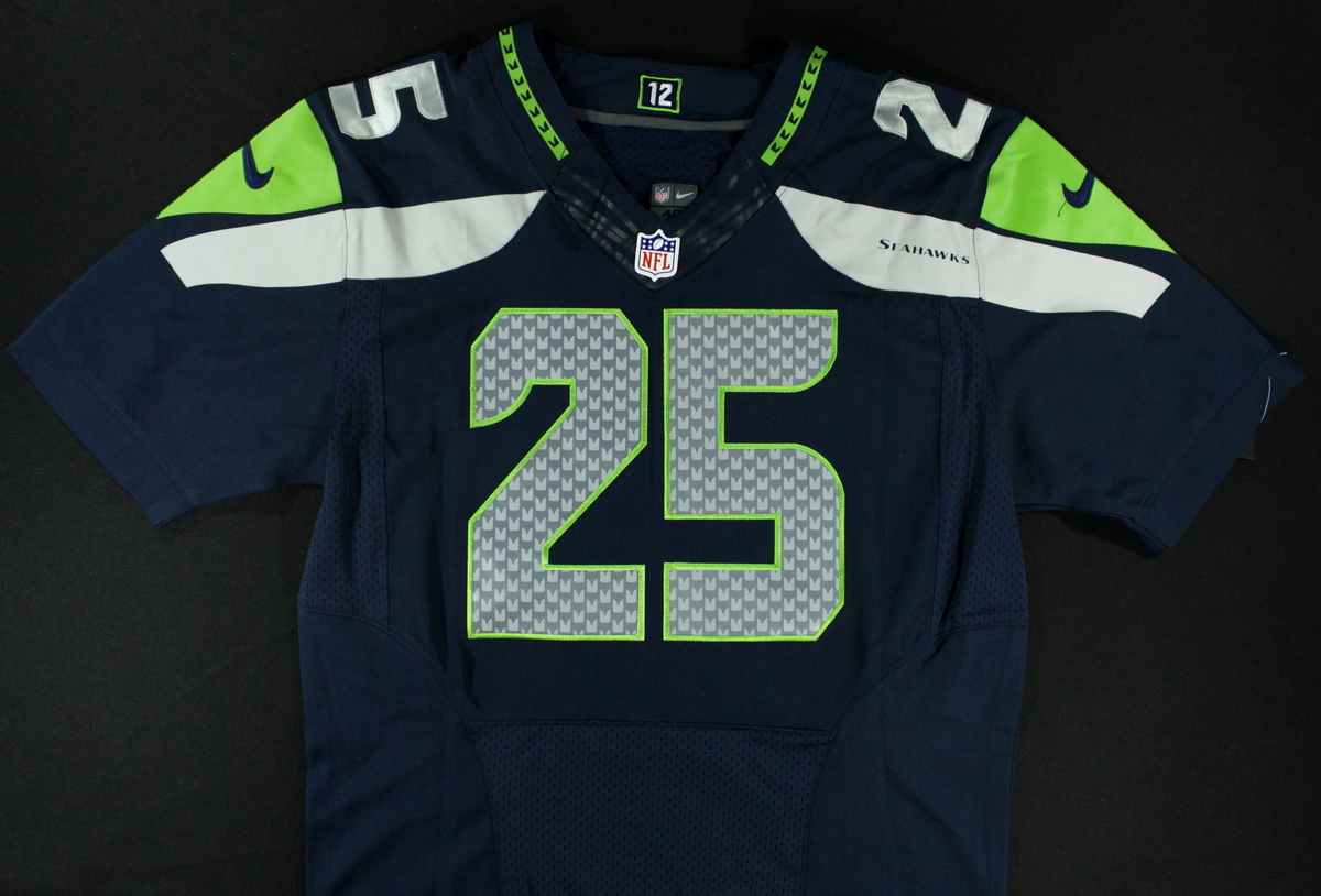 Nike on-field style jersey. Everything is sewn on, size 40. Hand-signed in black felt tip pen by Richard Sherman. Autograph includes an official Global Authentics (GA) hologram and matching COA for authenticity purposes.