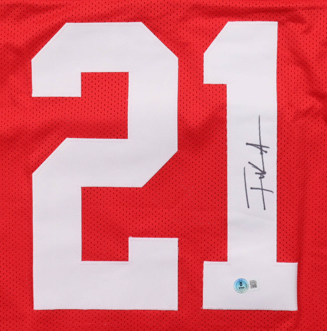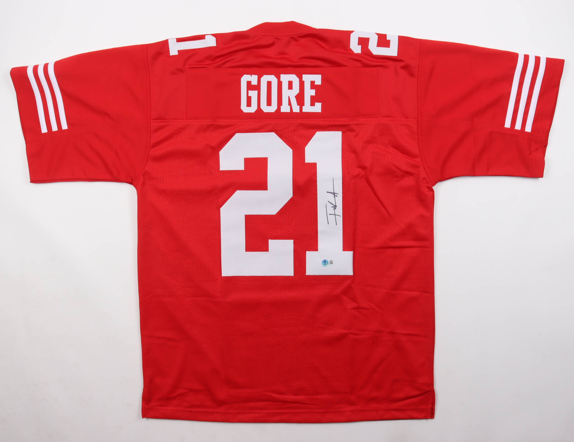 Custom jersey with everything sewn on, size XL. Hand-signed by Frank Gore.