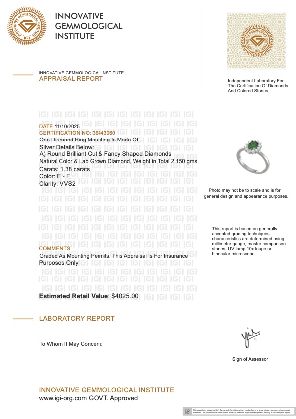 This piece includes paperwork from the Innovative Gemological Institute (IGI).