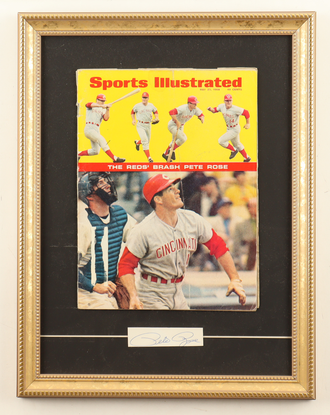 Custom frame measures 14" x 17.5” in size and features a May 27, 1968 Sports Illustrated magazine that has a cut that has been hand-signed by Pete Rose (Cincinnati Reds).