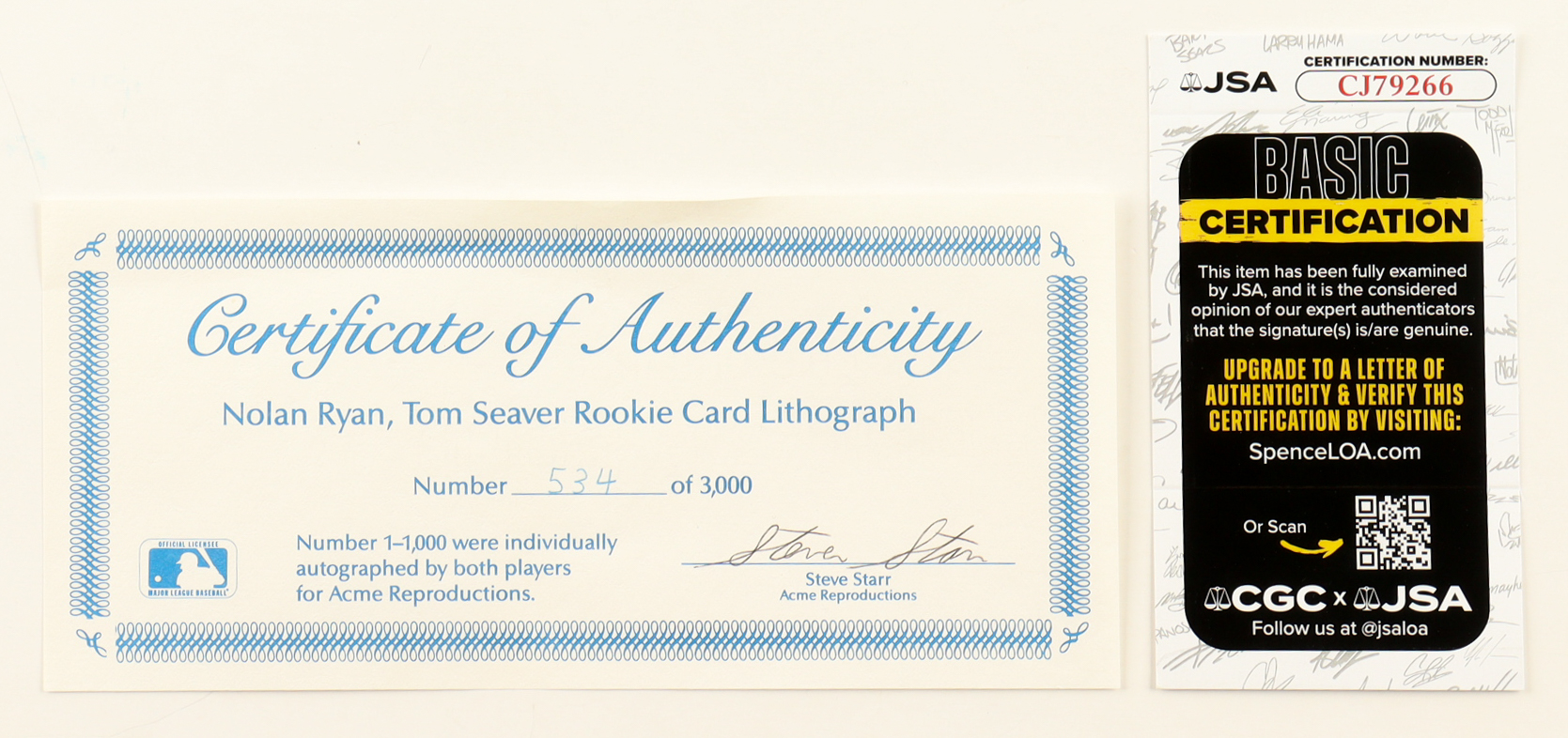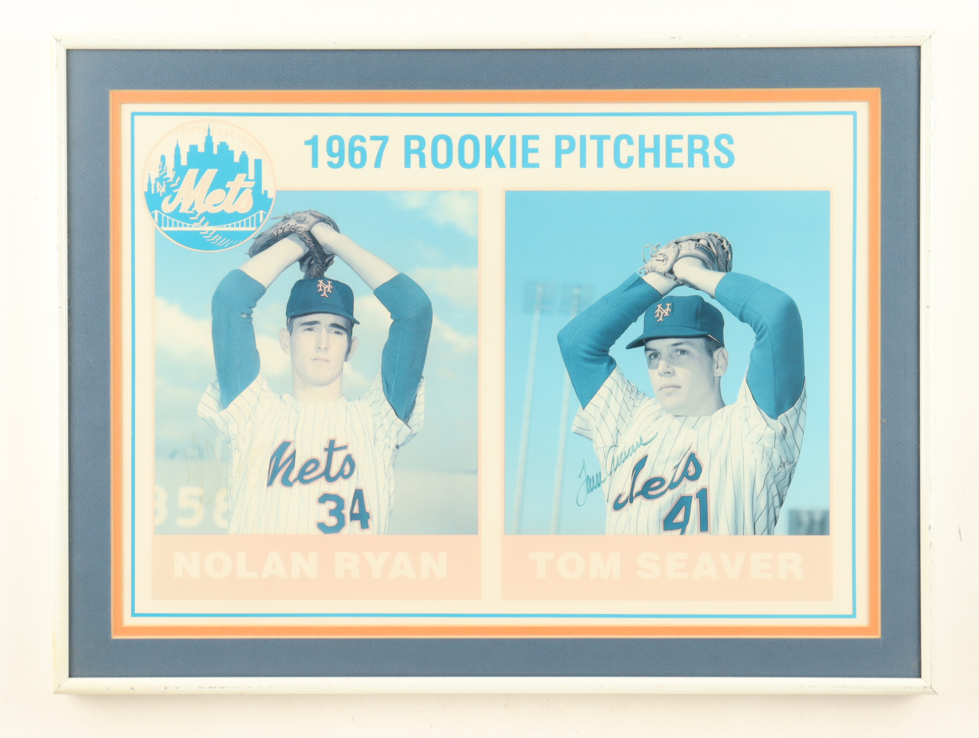 Display measures approximately 15" x 20" in size. The display features a lithograph rookie card whic has been hand-signed Nolan Ryan (New York Mets, HOF) and Tom Seaver (D. 2020, New York Mets, HOF). Limited edition #534/1000. Please note the Nolan Ryan signature is heavily faded.