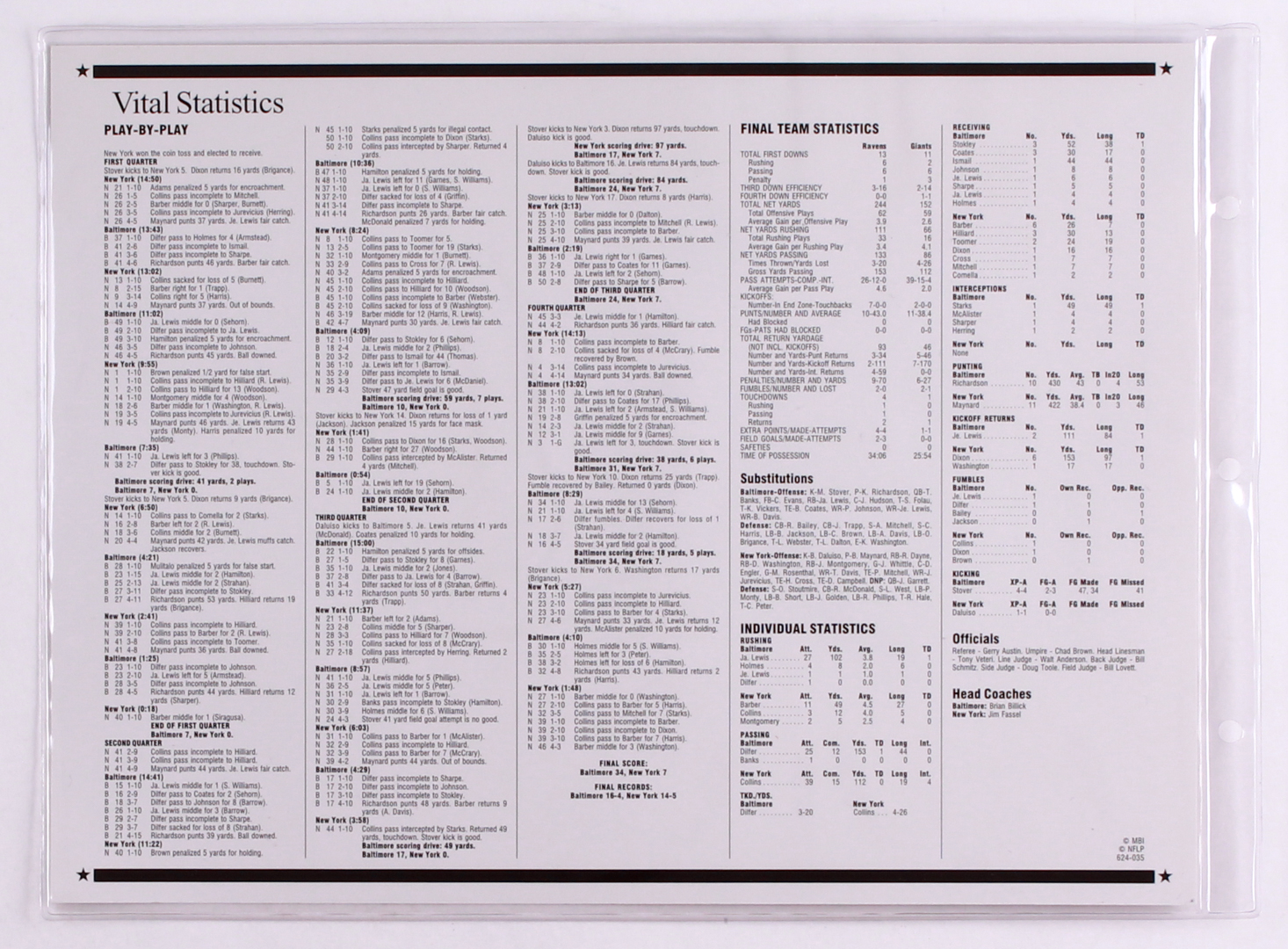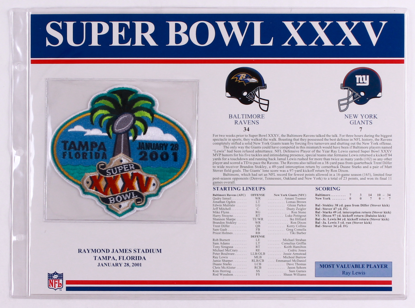 Commemorative Super Bowl XXXV Scorecard With Super Bowl Patch: Ravens vs Giants