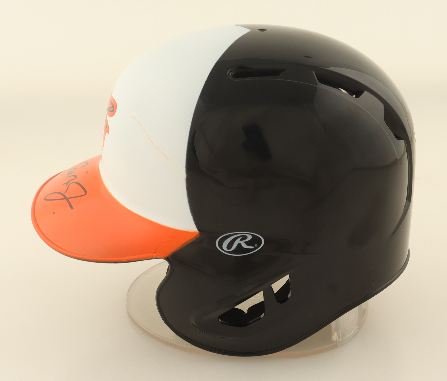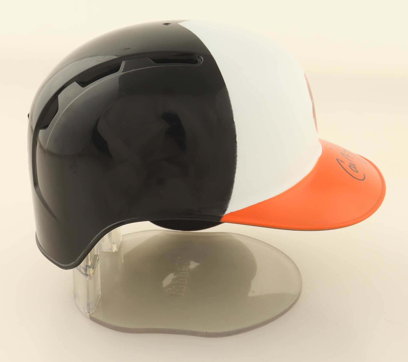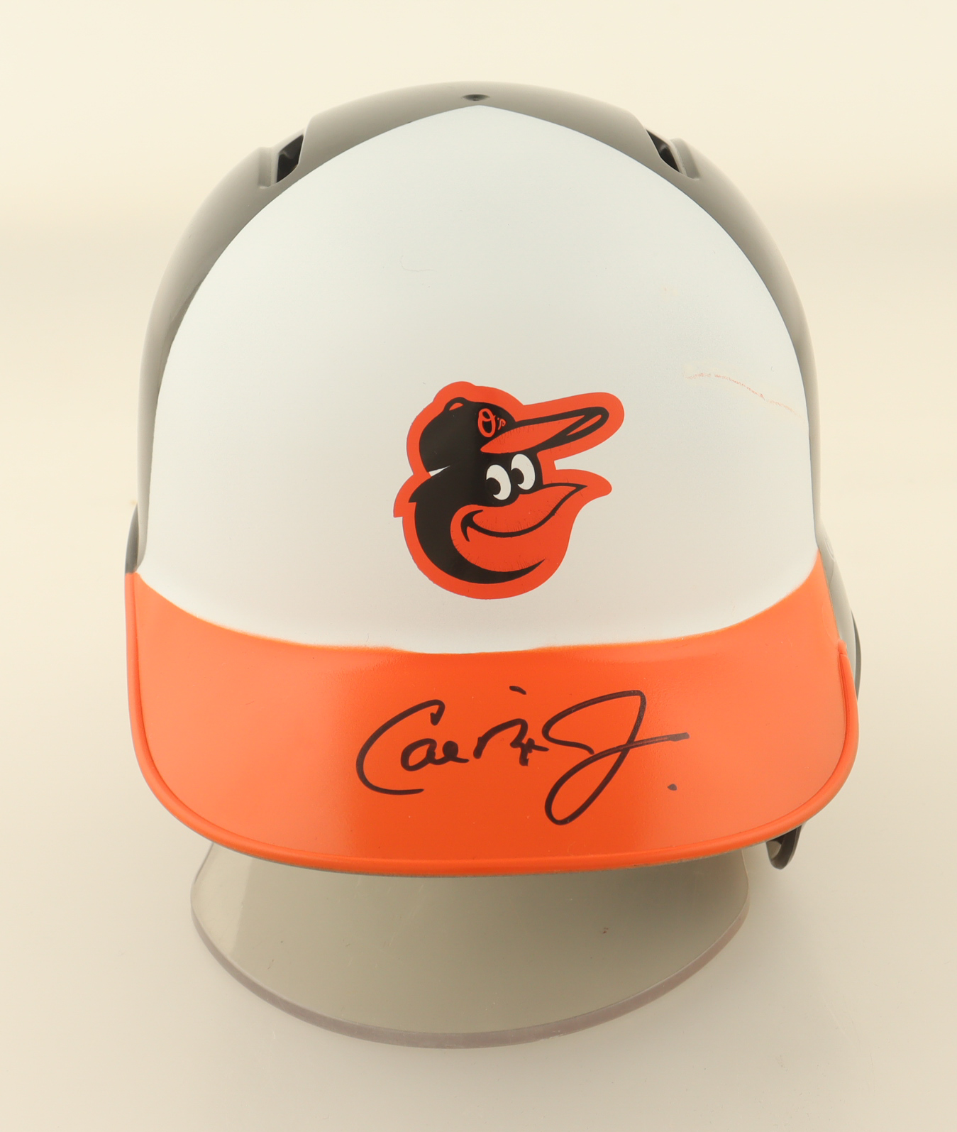 Rawlings Baltimore Orioles mini batting helmet has been hand-signed by Cal Ripken Jr. (HOF). Please note, the display stand is not included as shown and there is some scuffing on the top of the helmet.