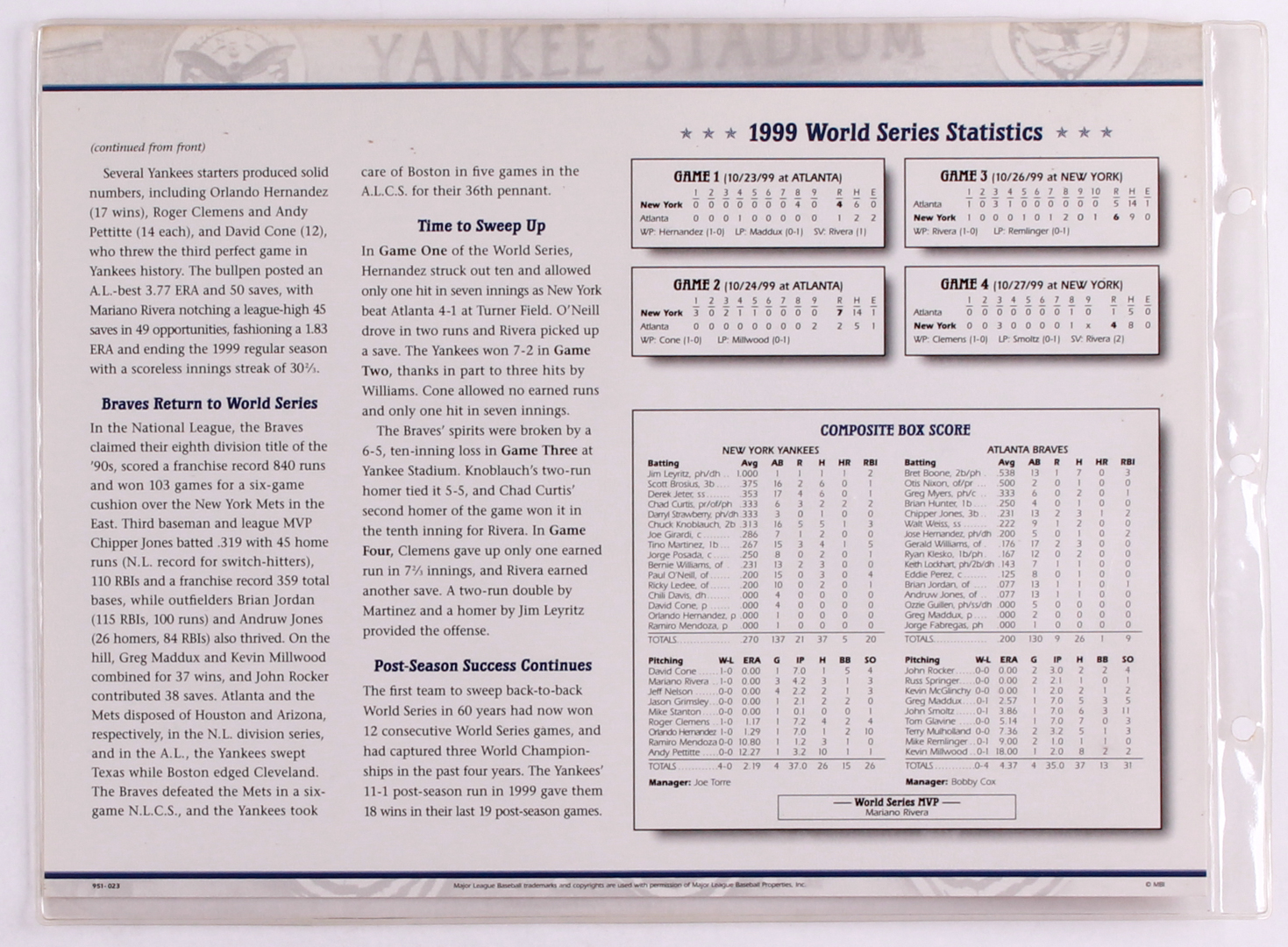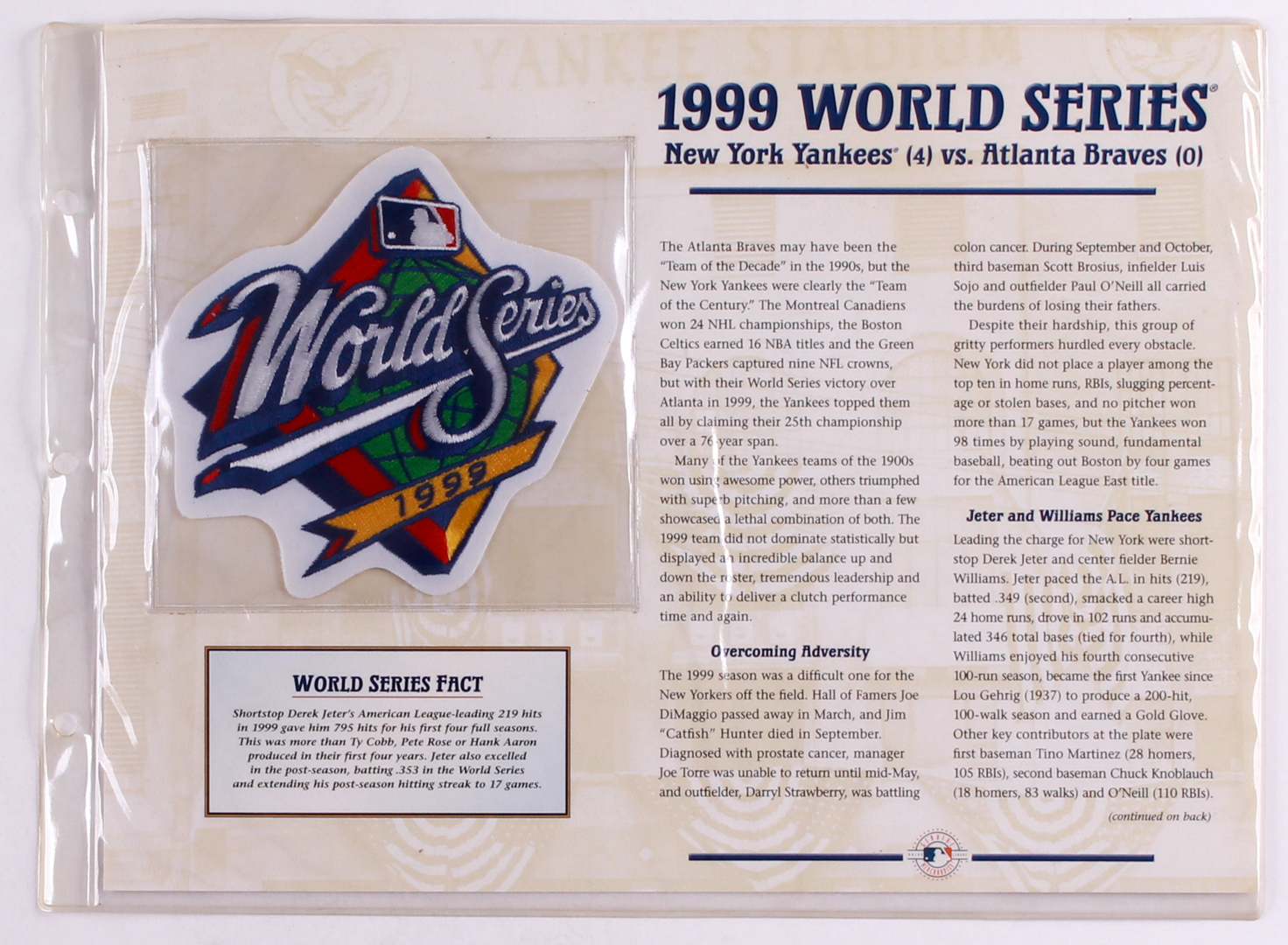 1999 World Series Patch Card with 9x12 Scorecard: Yankees vs Braves