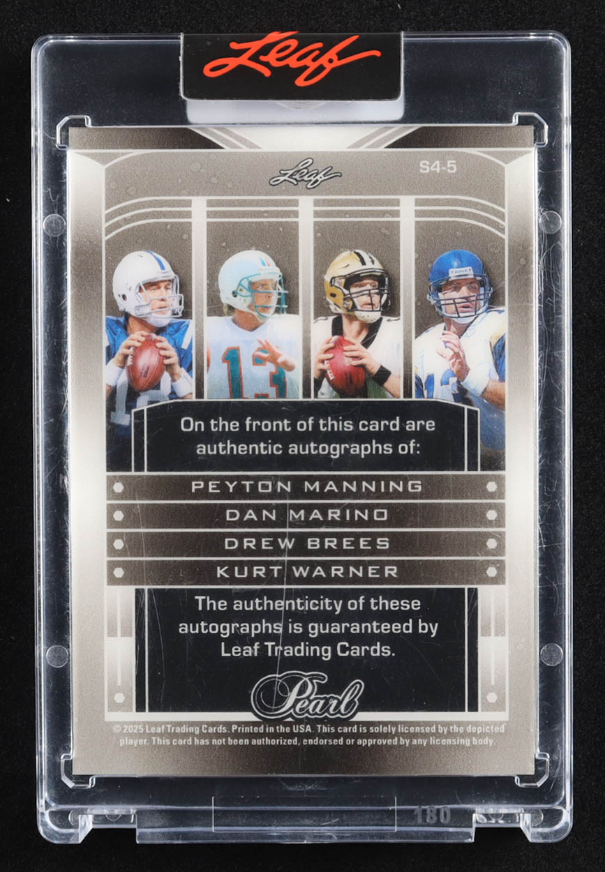 Peyton Manning / Dan Marino / Drew Brees / Kurt Warner 2025 Leaf Pearl Quad Signatures Spectrum Red #S45 #1/3