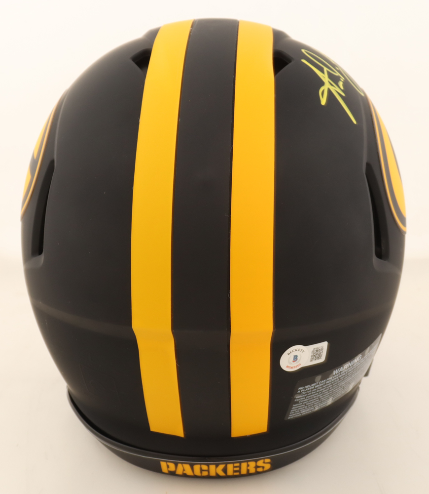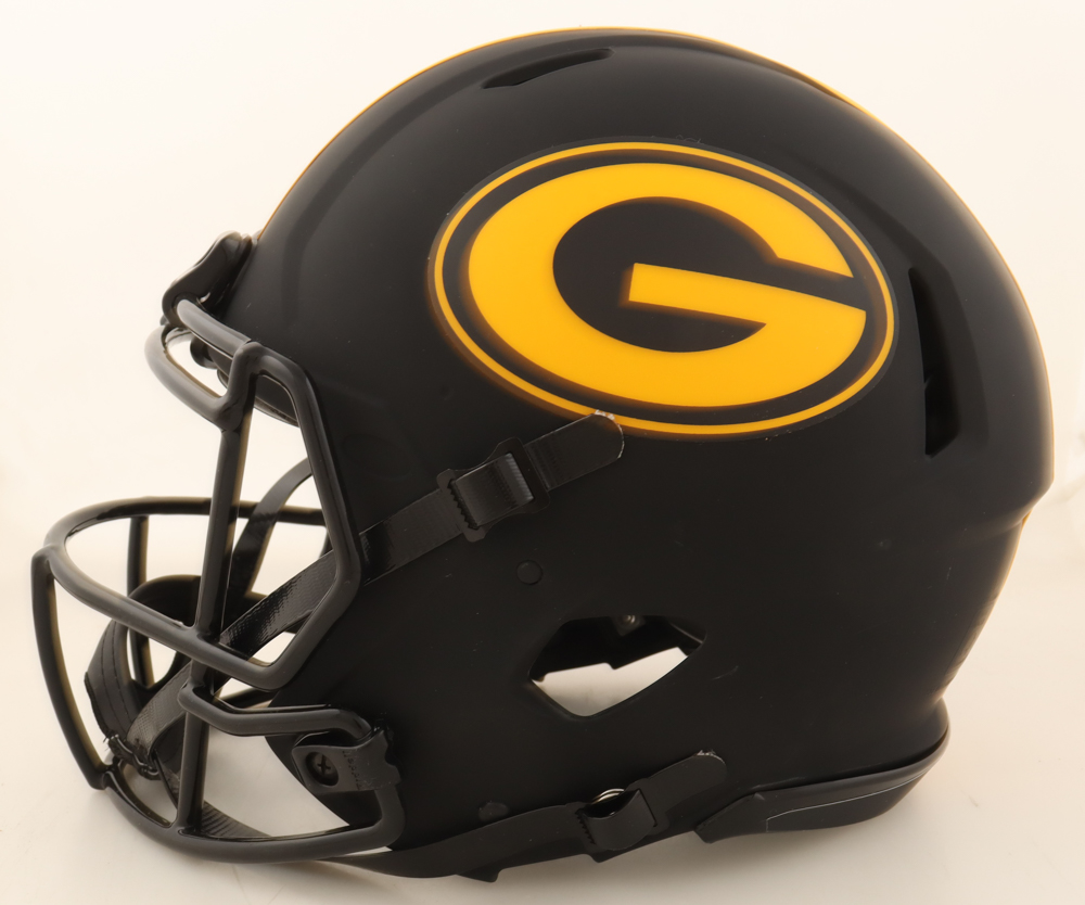 Riddell Green Bay Packers full-size authentic on-field eclipse alternate speed helmet. Hand-signed by Aaron Jones.