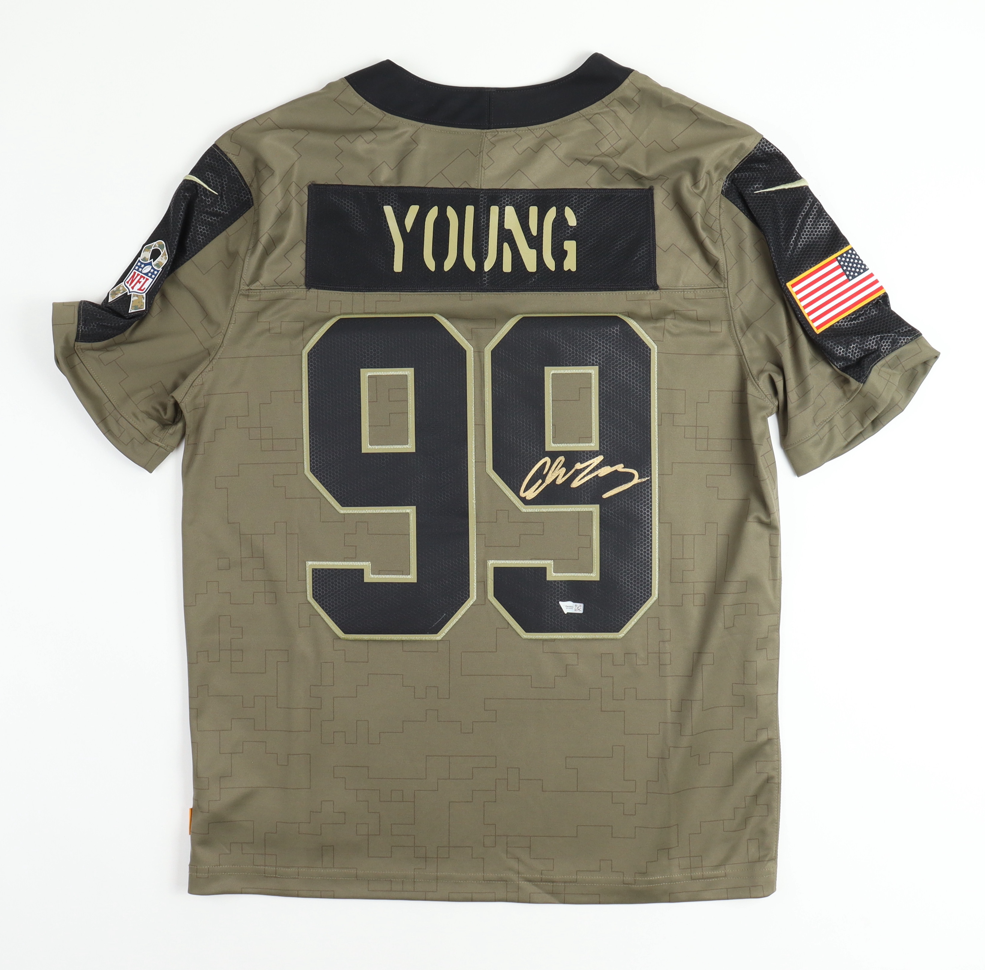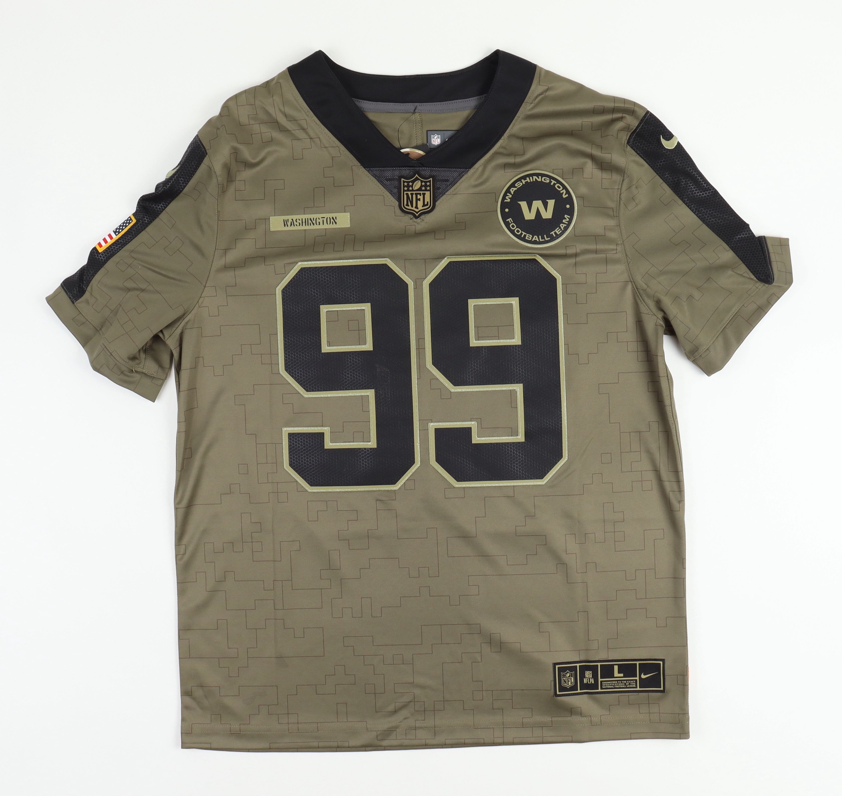 Nike on-field jersey. Everything is sewn on, size L. Hand-signed by Chase Young (Washington Football Team).
