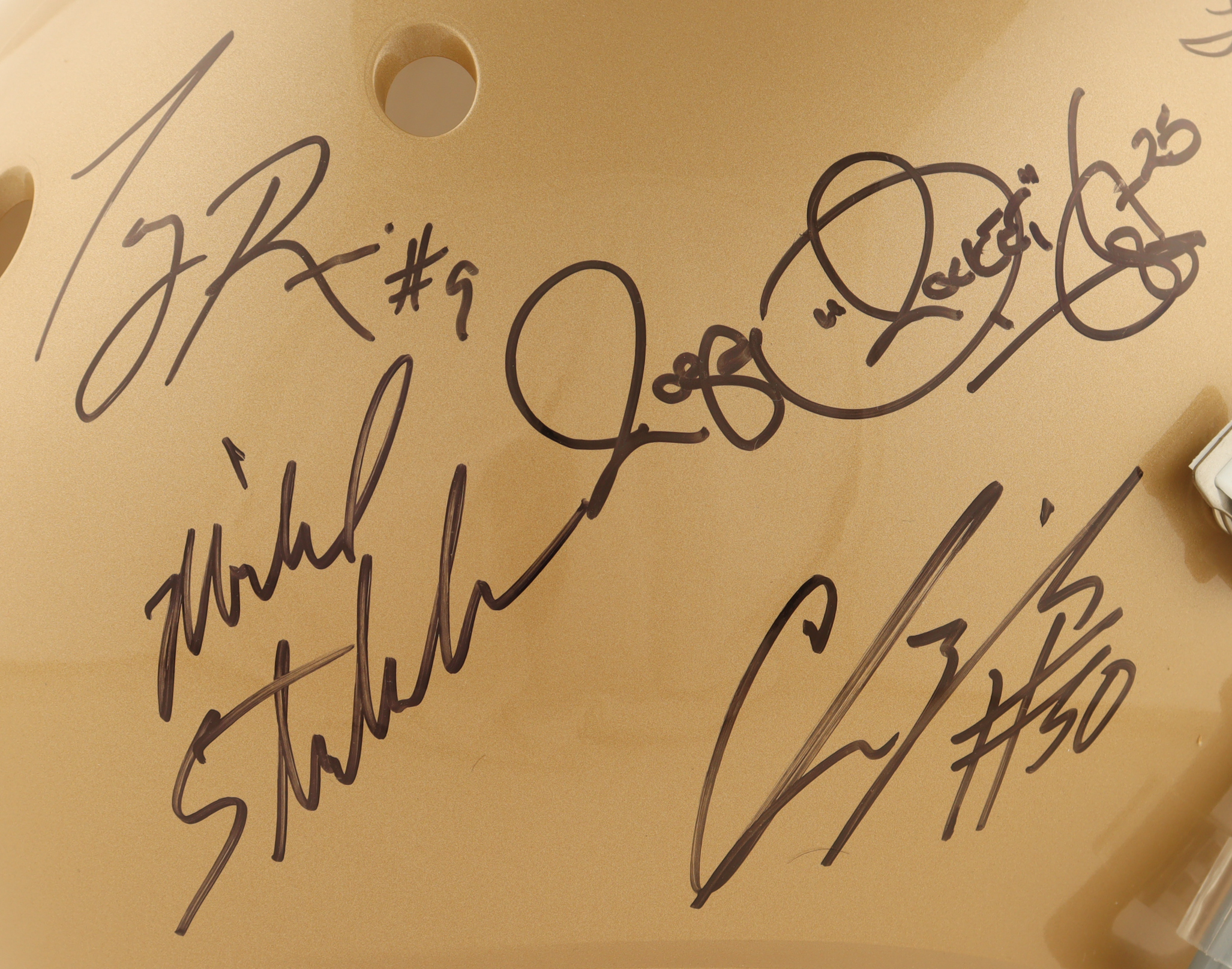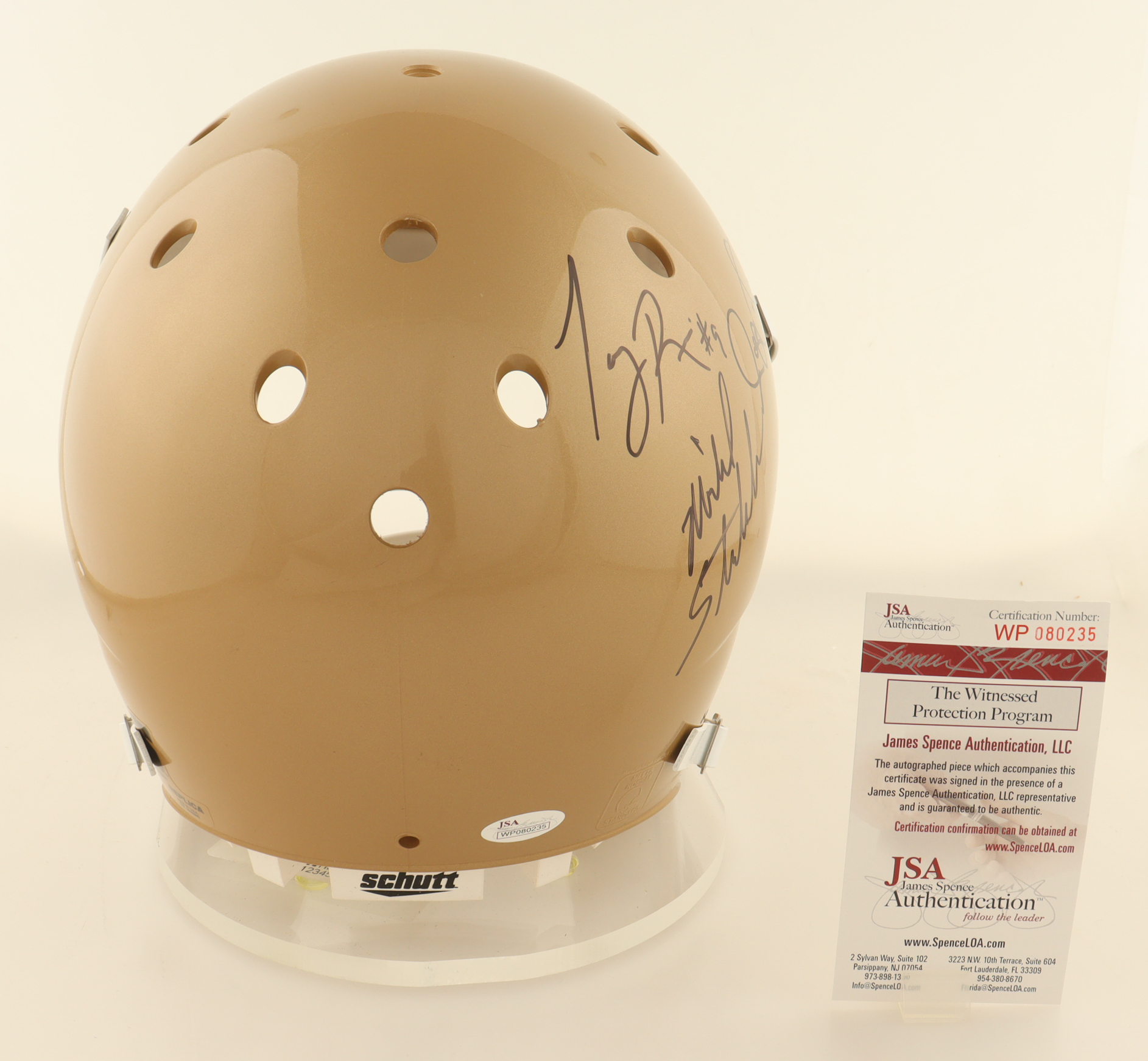 Schutt Notre Dame Fighting Irish full-size replica helmet. Hand-signed by Tony Rice, Lou Holtz, "Rocket" Ismail, Michael Stonebraker, Todd Lyght, and Chris Zorich.