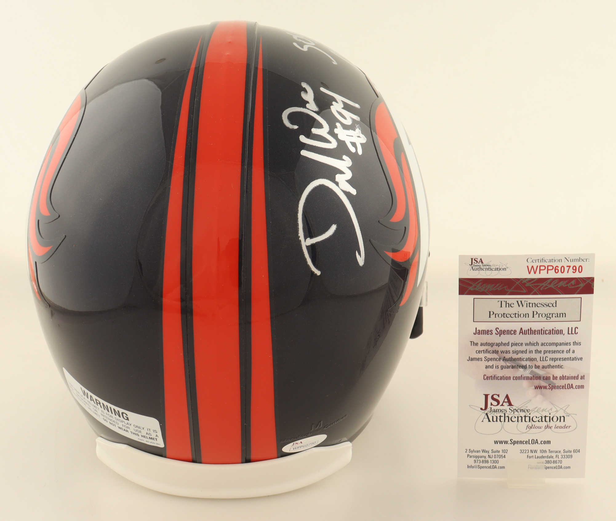 Riddell Denver Broncos full-size replica helmet. Has been hand-signed and inscribed by DeMarcus Ware (HOF).