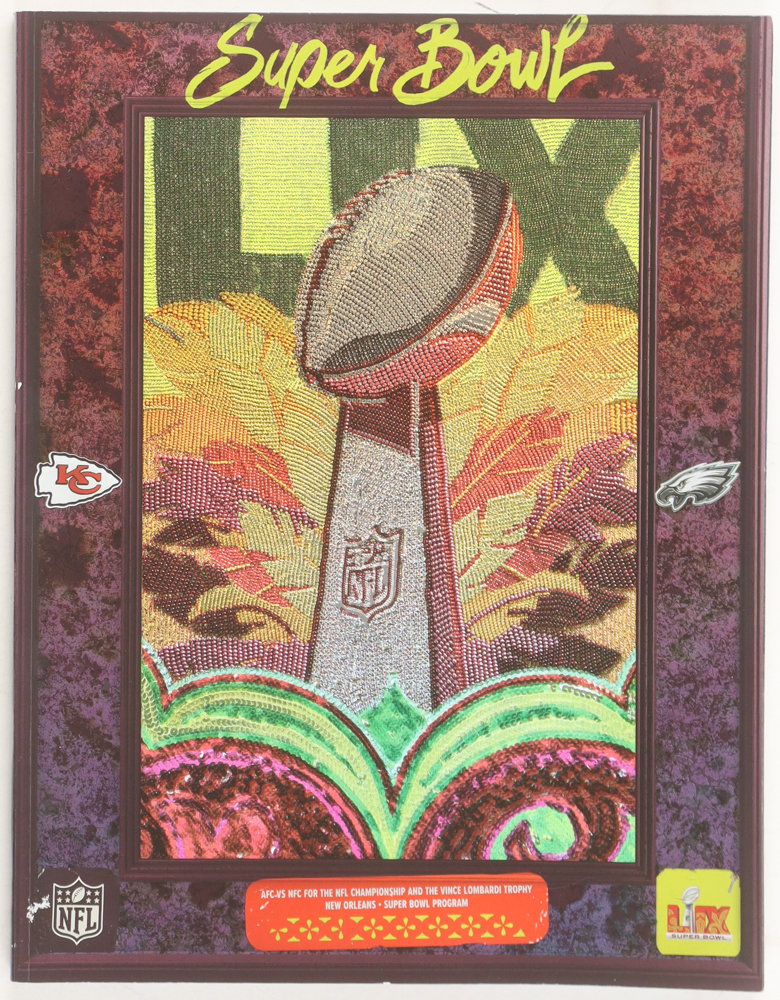 Official Super Bowl LIX program dated Sunday February 9, 2025. Please note, the program is unsigned and there are small surface tears, slight scuffing and corner wear on the cover.