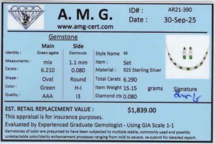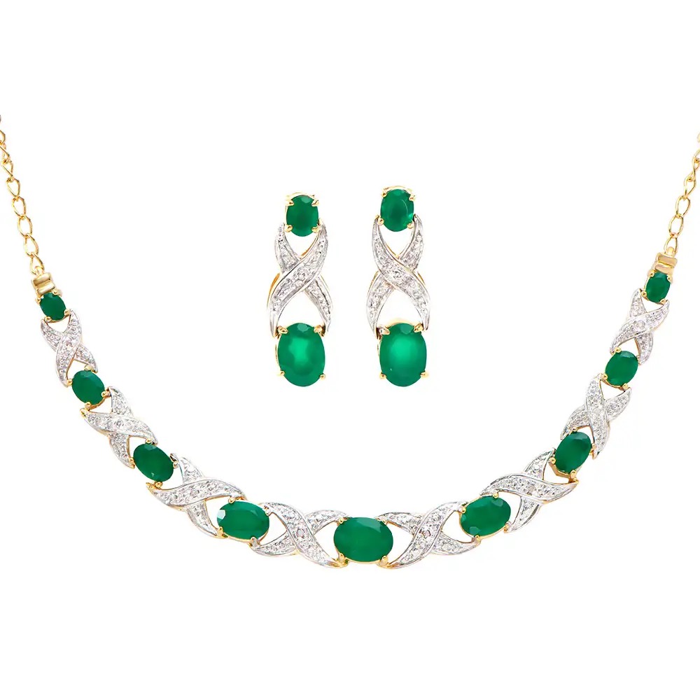 6.29 CTW Green Agate & Diamonds 18K Gold Plated Designer Necklace & Earrings Set 19 Inches (15.15 grams) Contains: