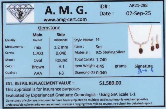 1.74 CTW Garnets & Diamonds 18K Gold Plated Designer Necklace & Earrings set (4.45 grams) Contains: