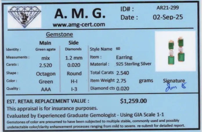 2.54 CTW Green Agate & Diamonds 18K Gold Plated Designer Earrings| Estimated Retail Value: $1,259 (AMG)