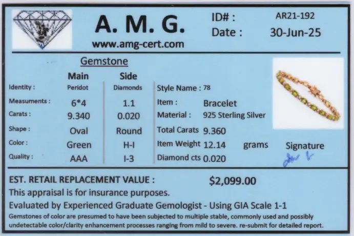 9.36 CTW Peridot & Diamond 18K Gold Plated Designer Bracelet Size 7.7 Inches (12.14 grams) Contains:
