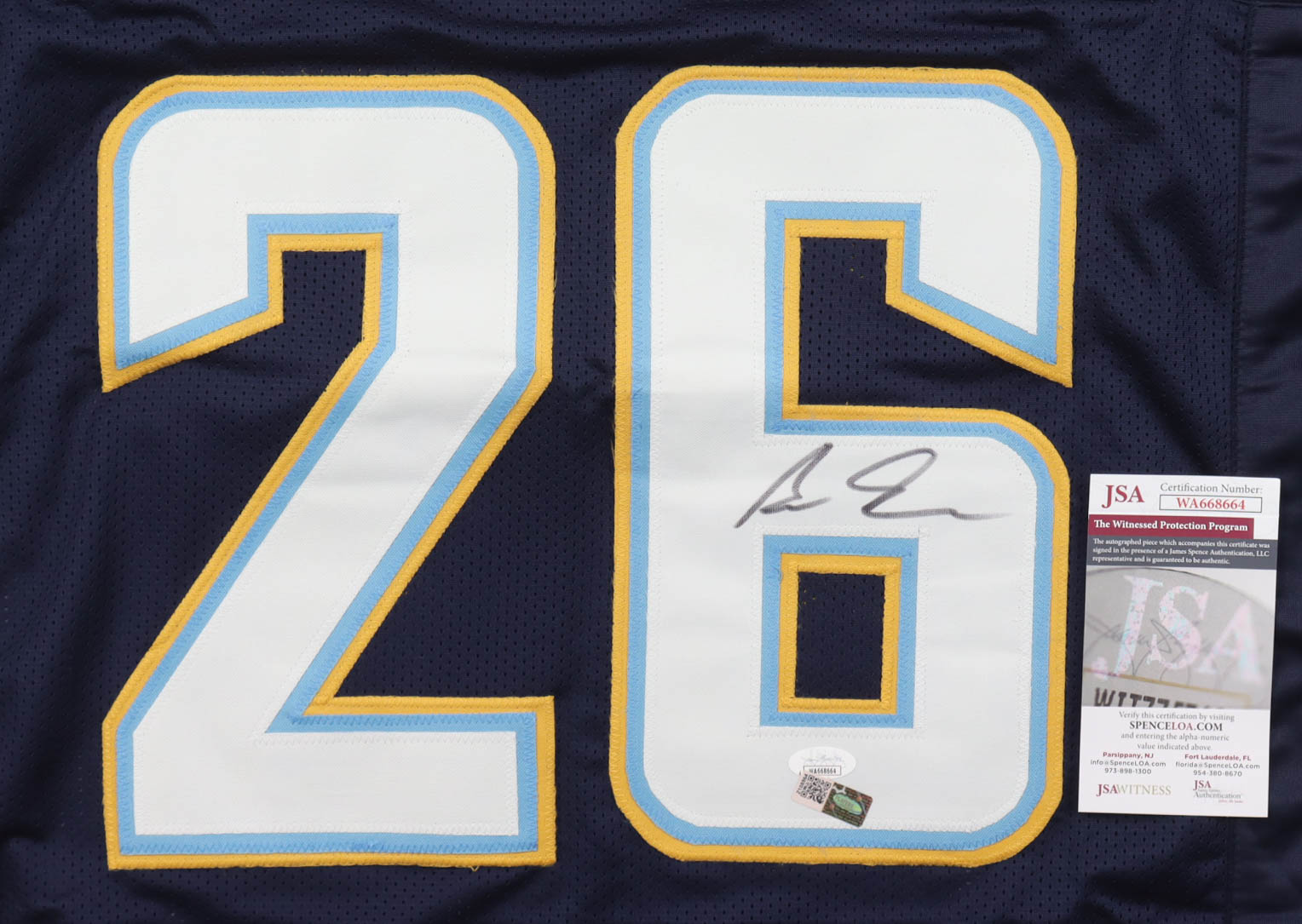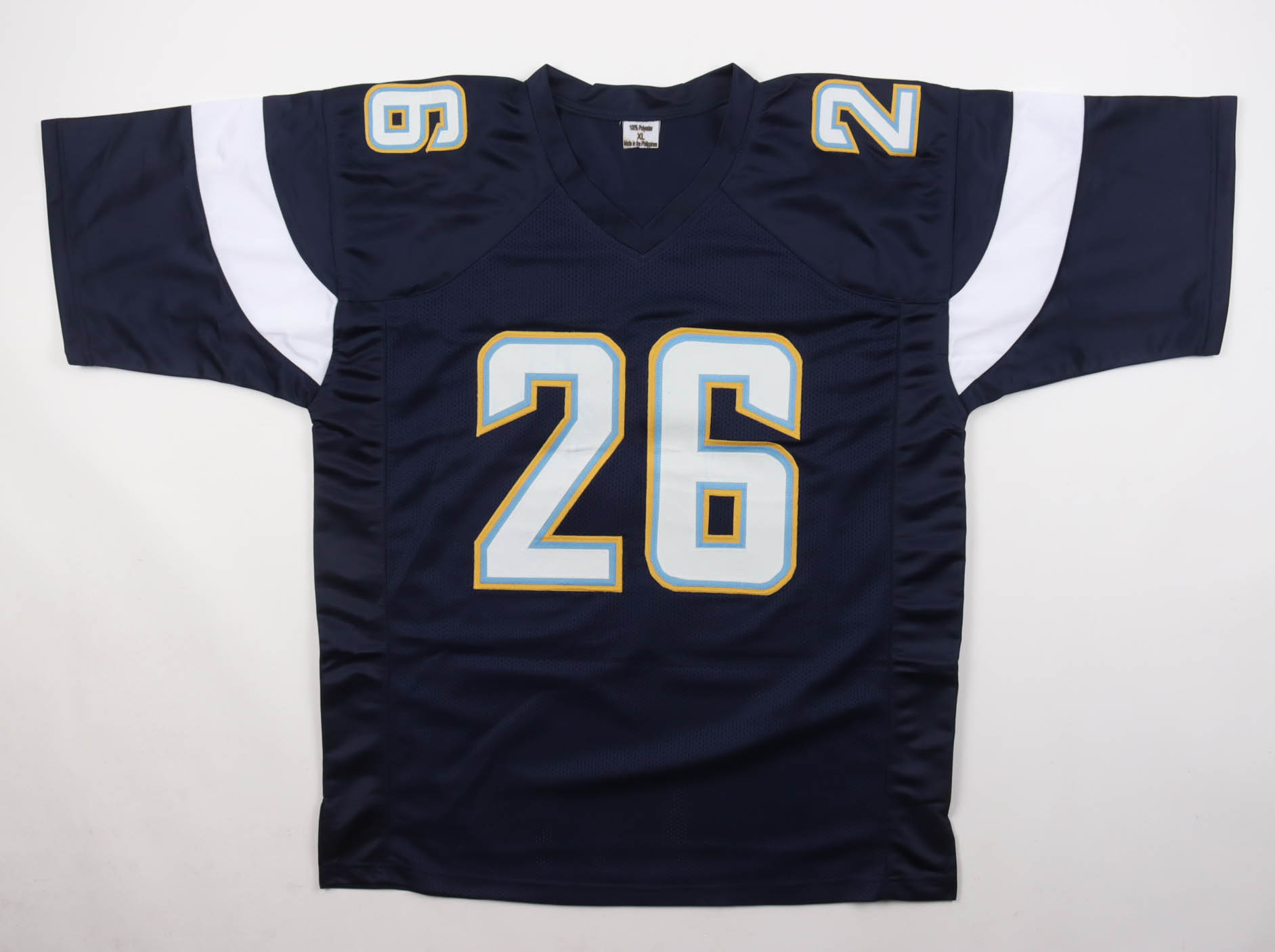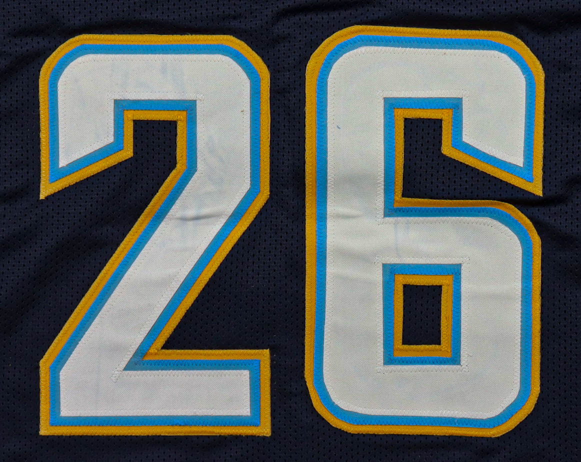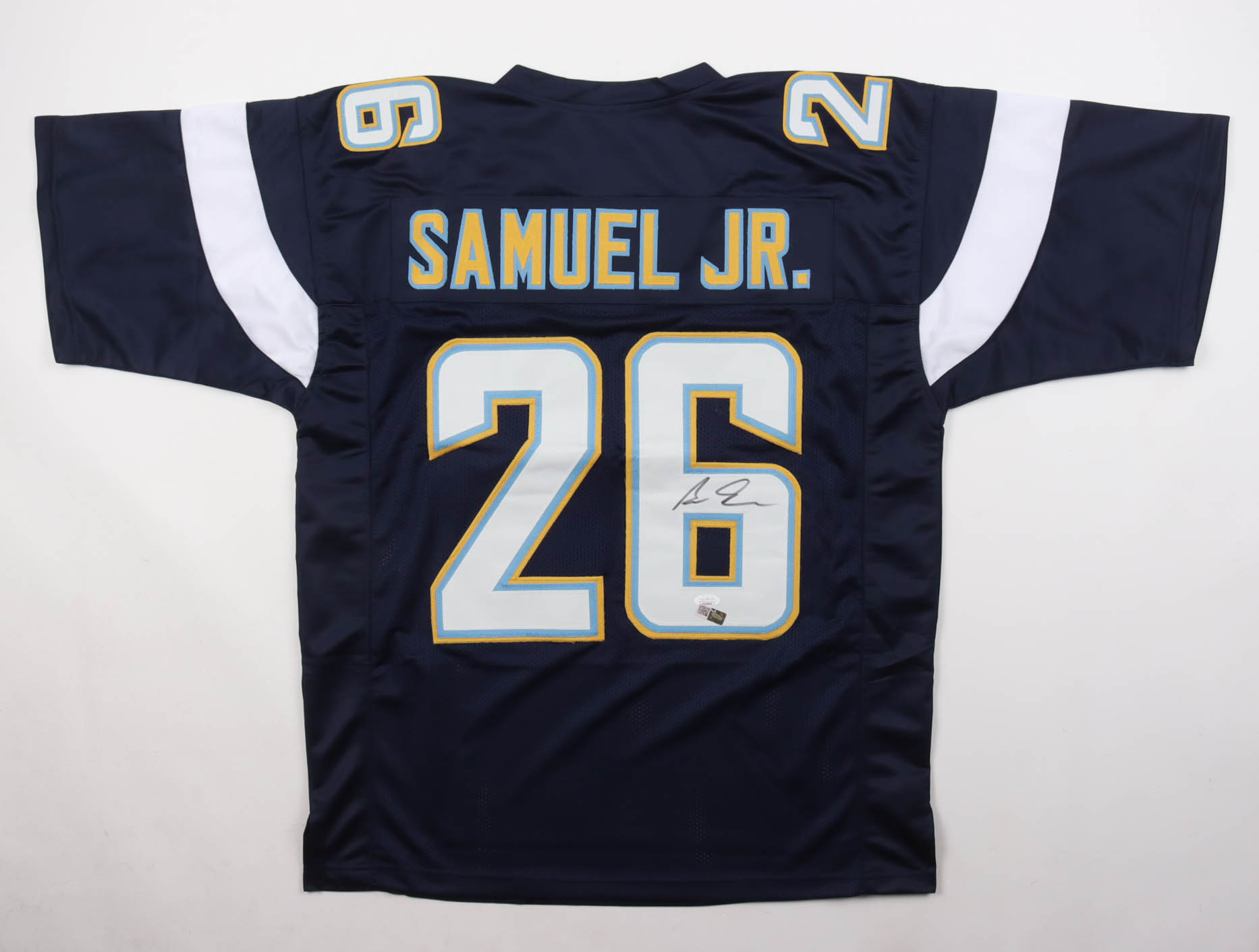 Custom jersey with everything sewn on, size XL. Hand-signed by Asante Samuel Jr. (Los Angeles Chargers). Please note, the glue is visible through the front numbers.