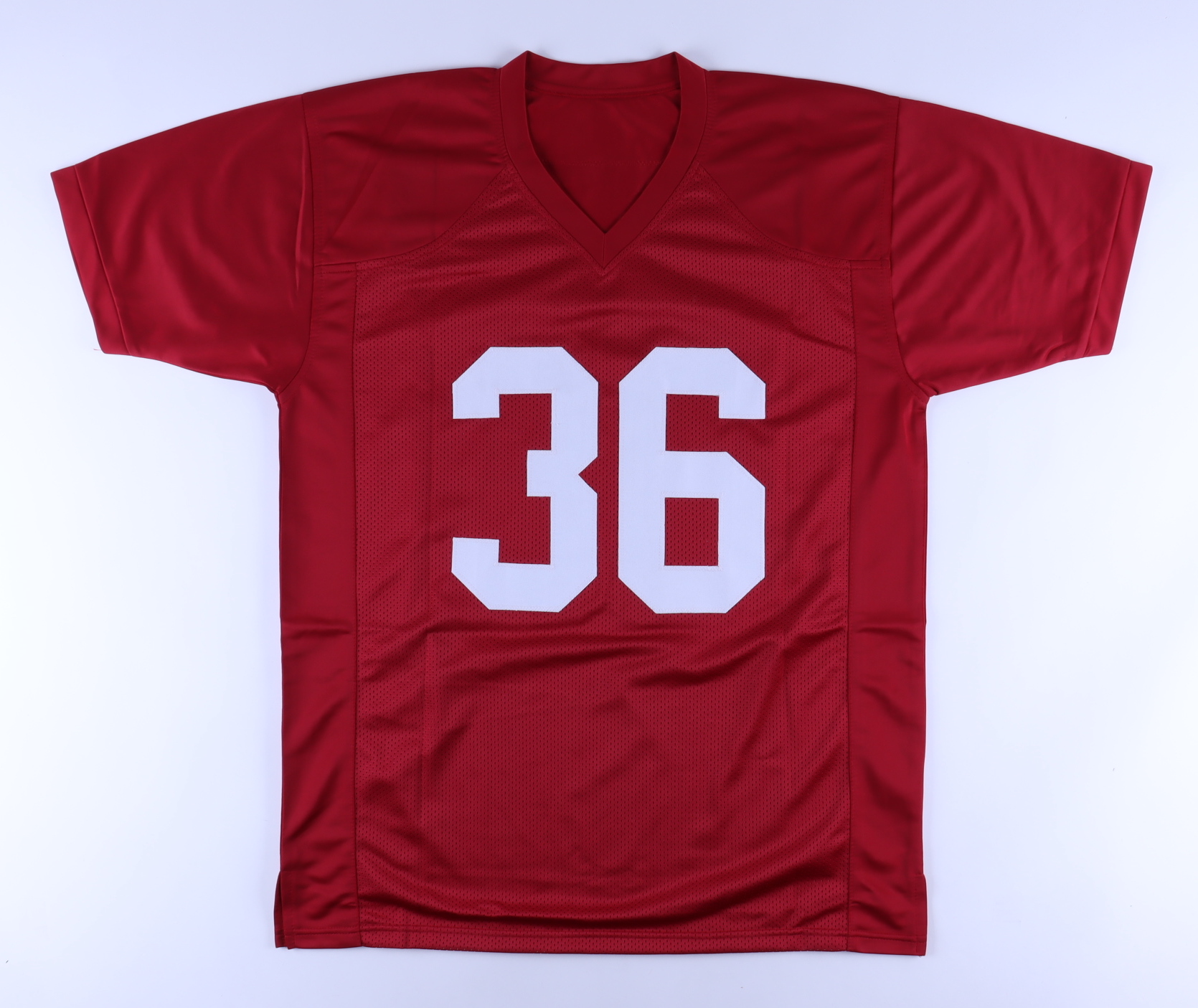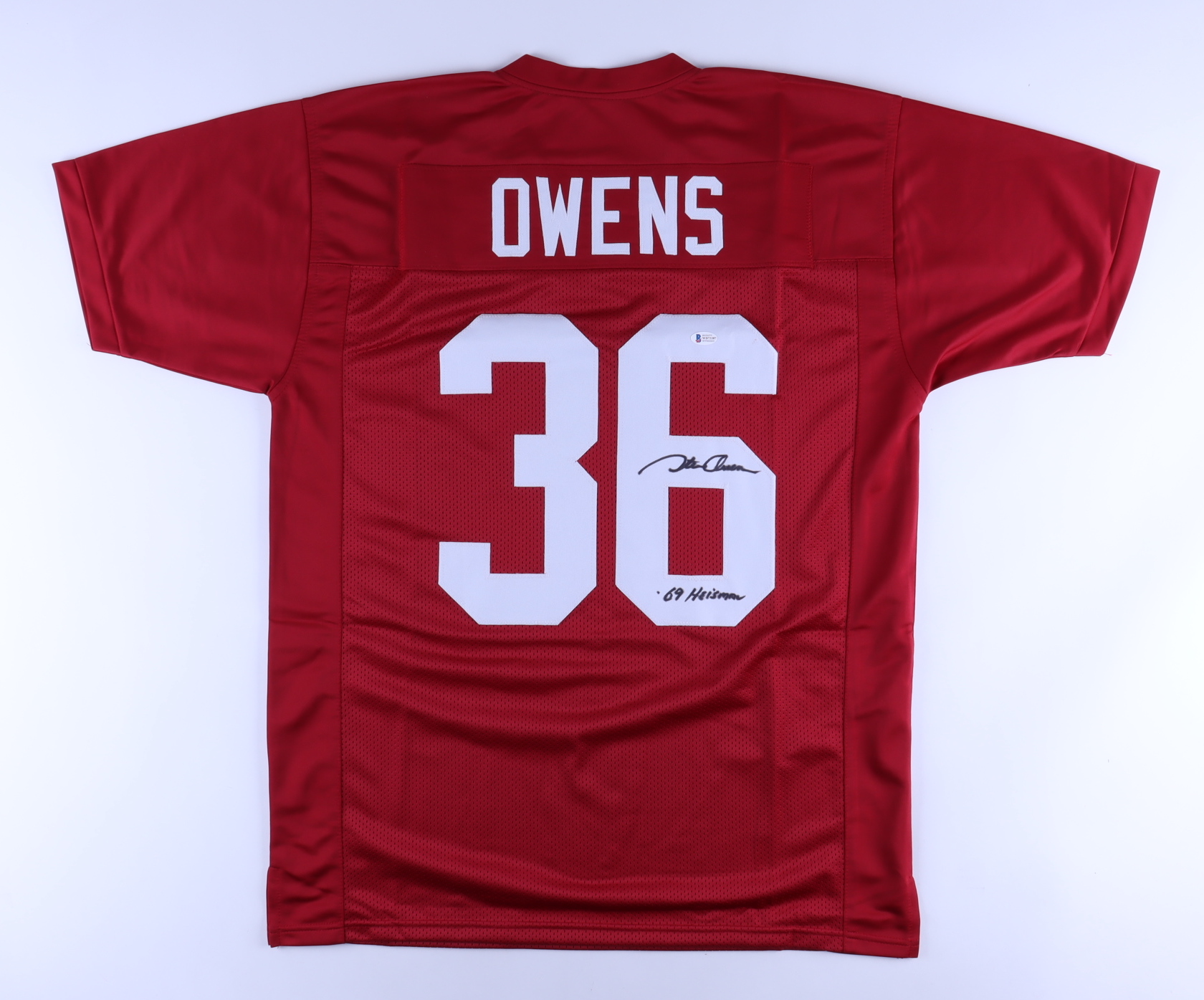 Custom jersey. Everything is sewn on, size XL. Hand-signed and inscribed by Steve Owens. Please note, the signature and inscription have bled.