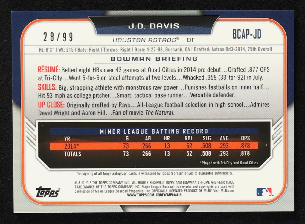 J.D. Davis 2015 Bowman Chrome Prospect Autographs Green Refractors #BCAPJD RC #28/99