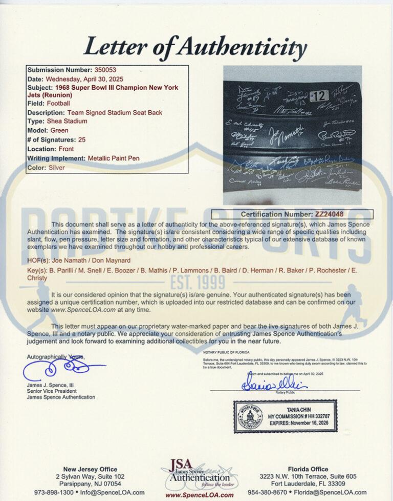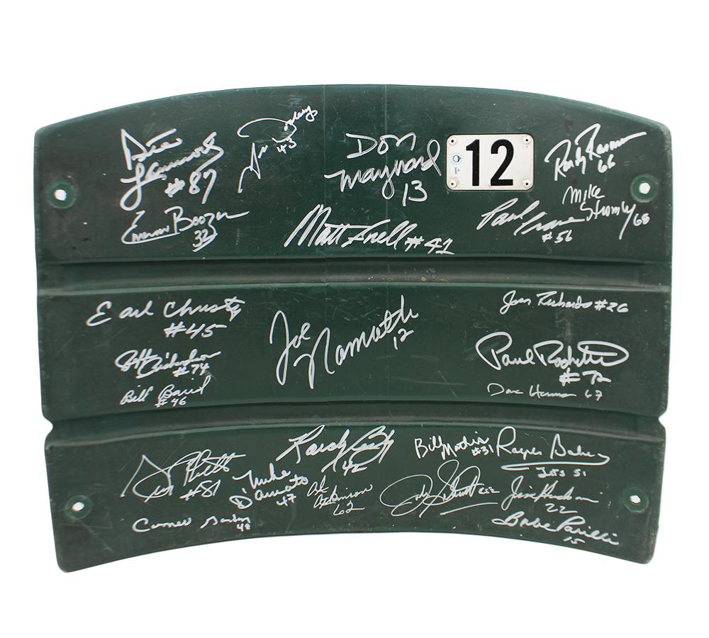 Shea Stadium #12 seatback has been hand-signed by (25) members of the 1969 New York Jets! Signers include Joe Namath, Don Maynard, Babe Parilli, Matt Snell, Emerson Boozer, Bill Mathis, Pete Lammons, Bill Baird, Dave Herman, Ralph Baker, Paul Rochester, Earl Christy and (13) others.