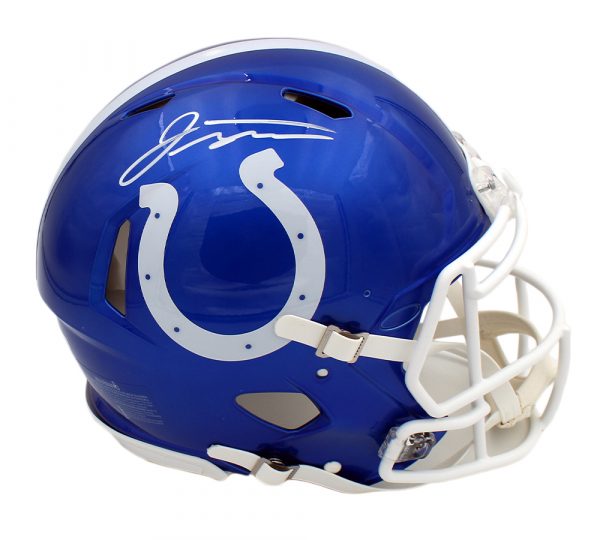 Riddell Indianapolis Colts full-size authentic on-field Flash Alternate speed helmet. Has been hand-signed by Jonathan Taylor.