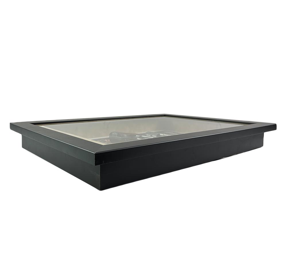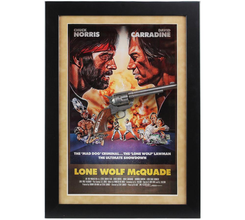 Shadowbox display measures 20" x 28" x 3" in size and features a Denix Replica Colt Calvary 1873 Revolver Prop hand-signed by Chuck Norris.