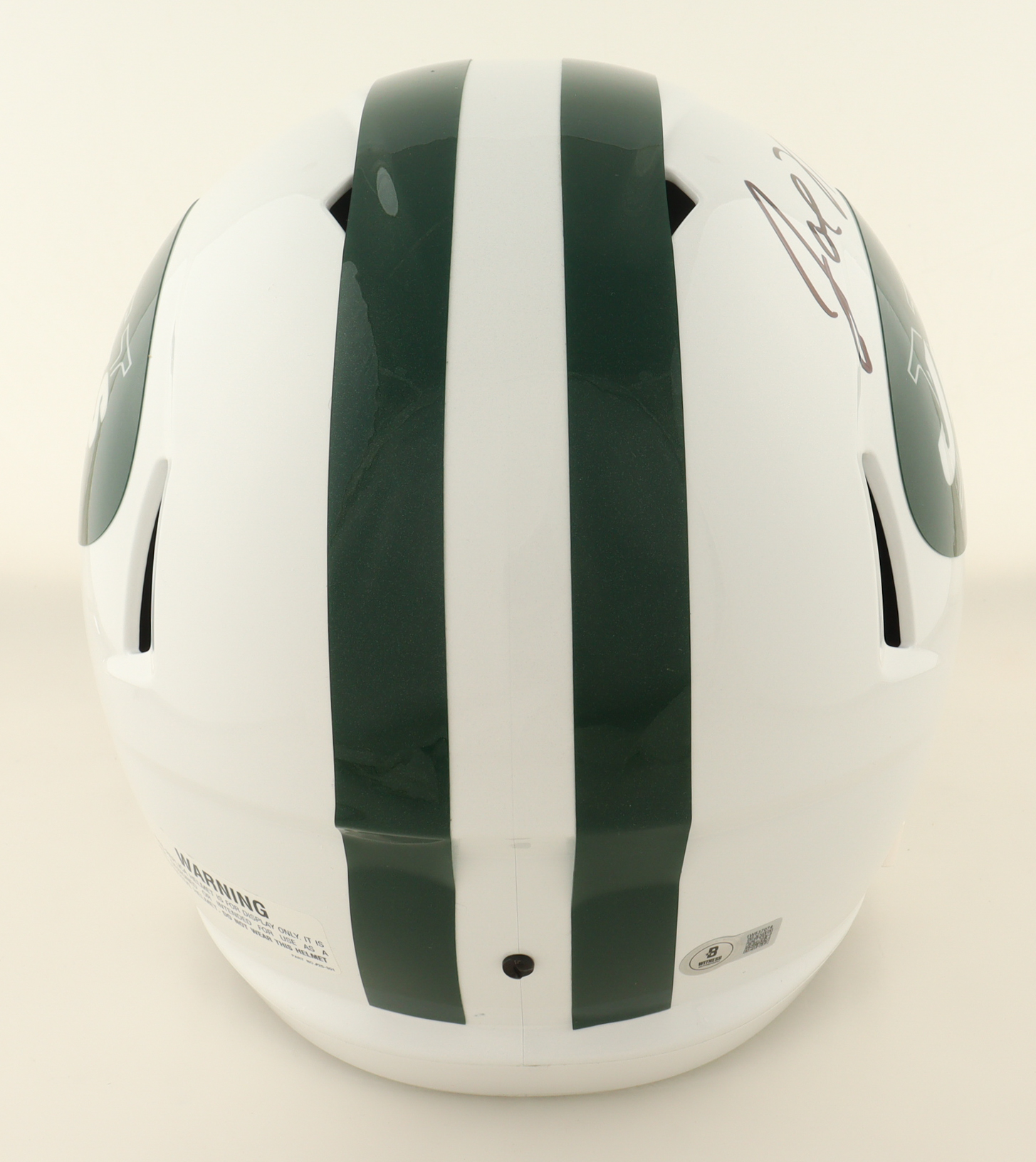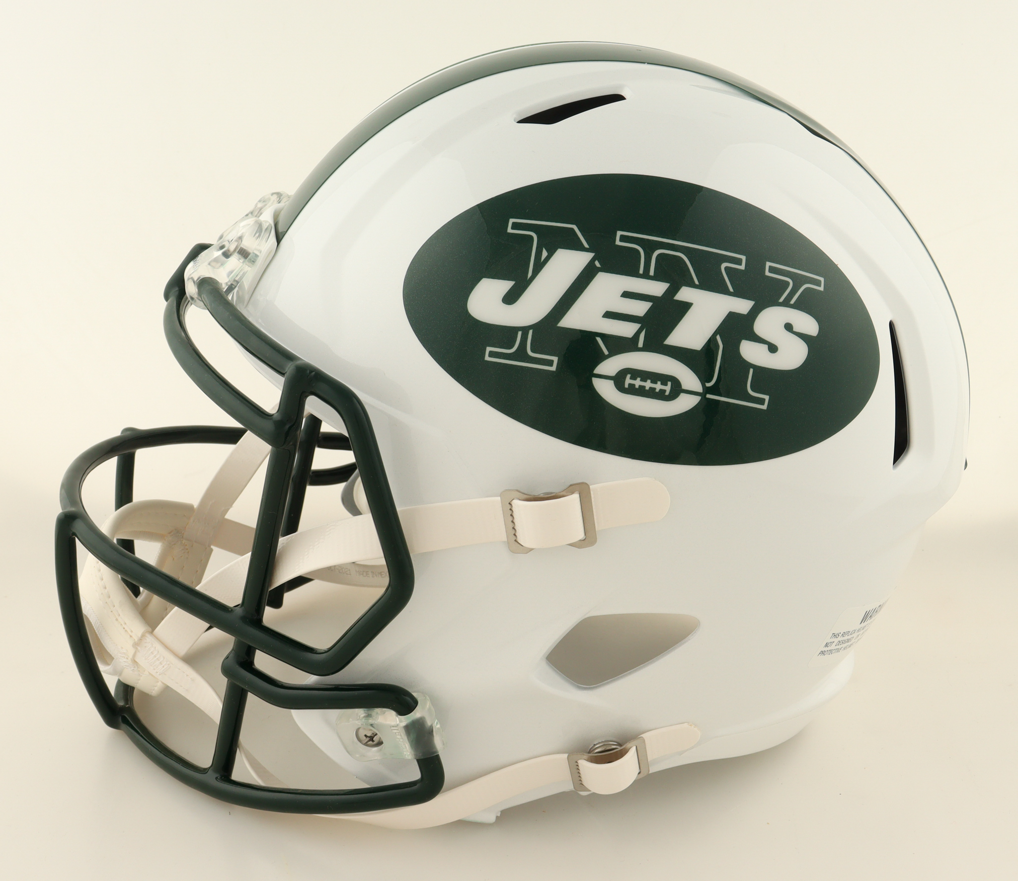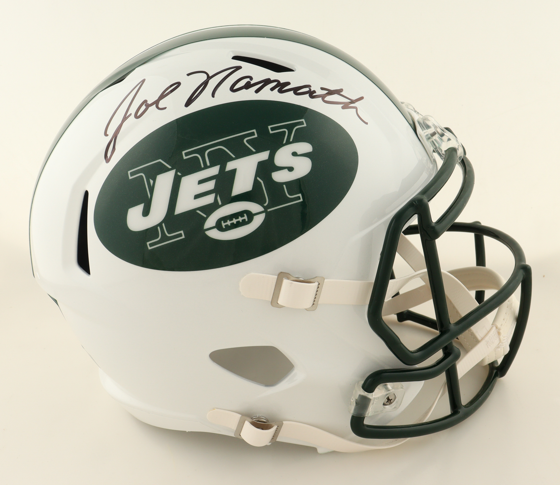 Riddell New York Jets full-size White Alternate replica Speed helmet has been hand-signed by Joe Namath (HOF).