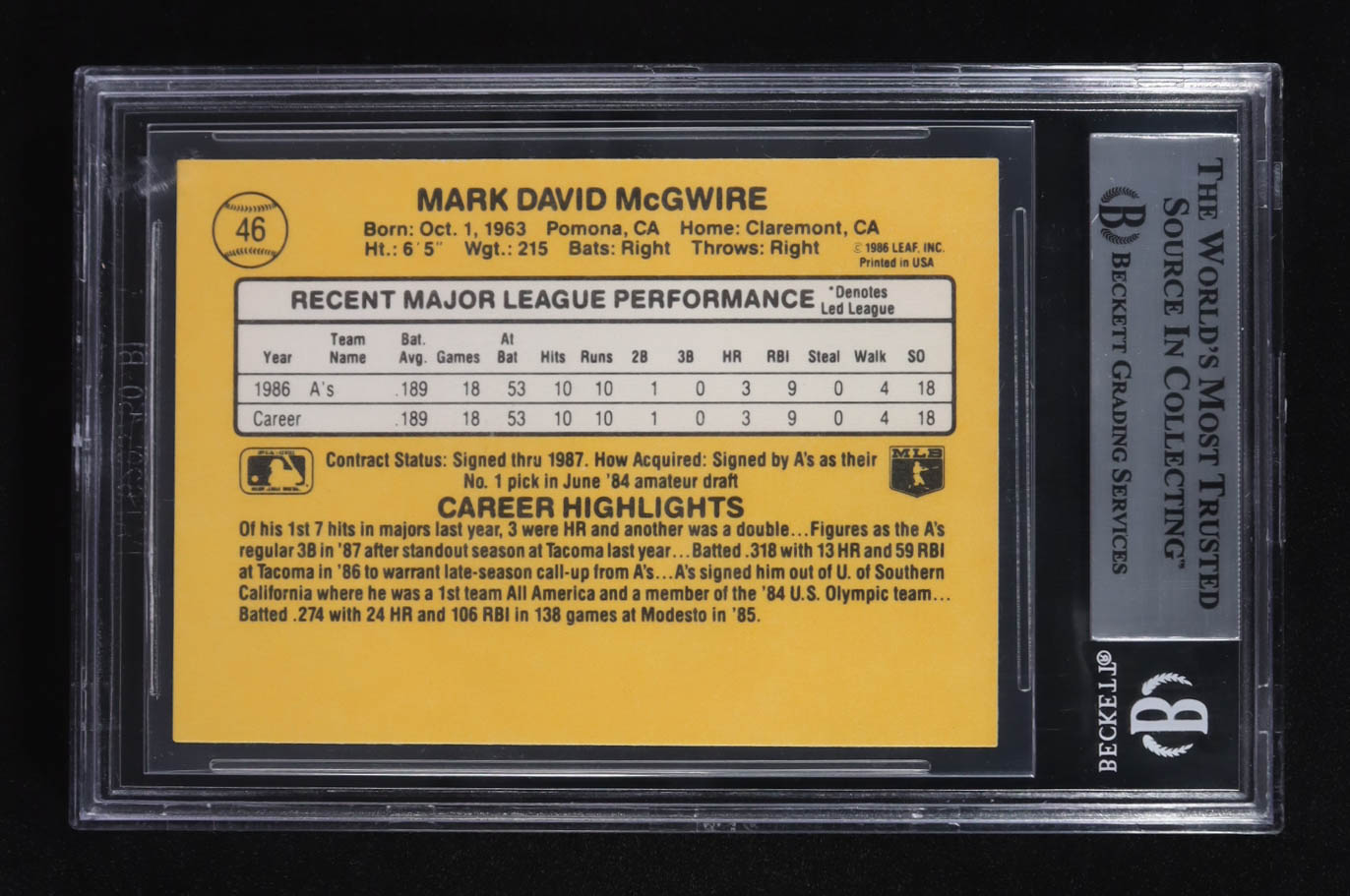 Mark McGwire 1987 Donruss Rated Rookie #46 RC (BGS 9)