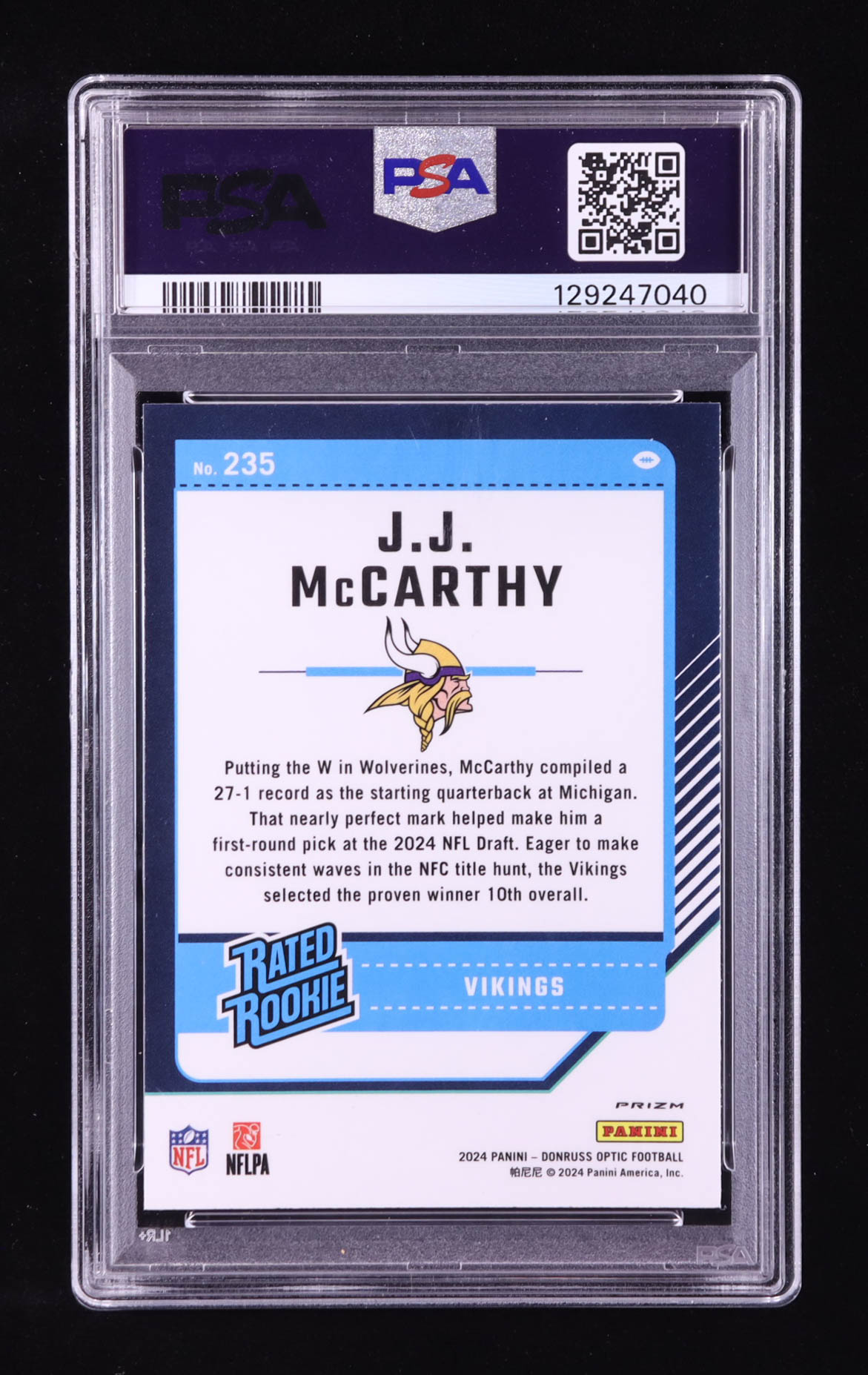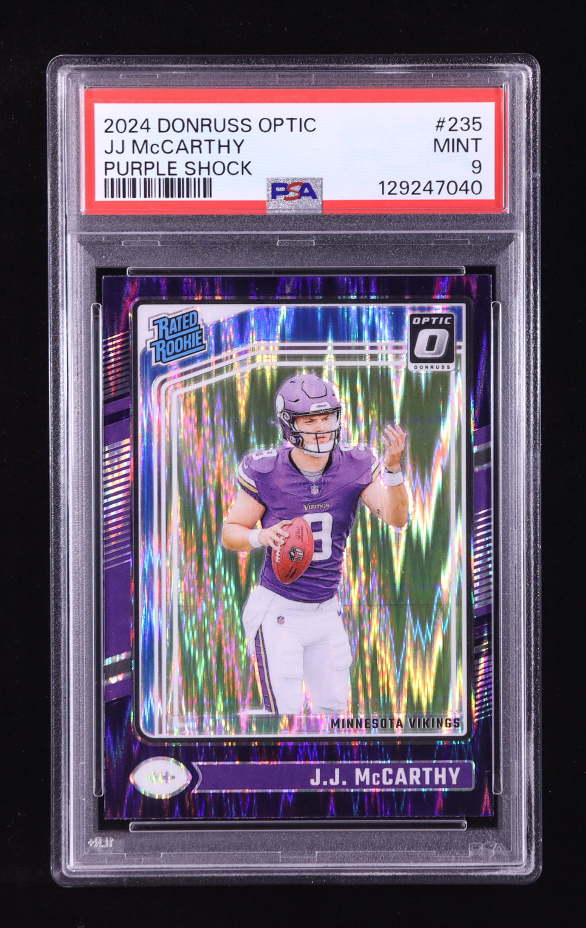 JJ McCarthy 2024 Donruss Optic Purple Shock #235 RR RC (PSA 9)
