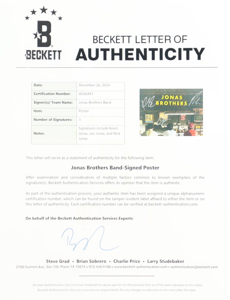Poster measures 11" x 17" in size and has been hand-signed by Nick Jonas, Joe Jonas and Kevin Jonas. Please note, there is a crease from the fold across the center and Joe Jonas' signature is smudged.